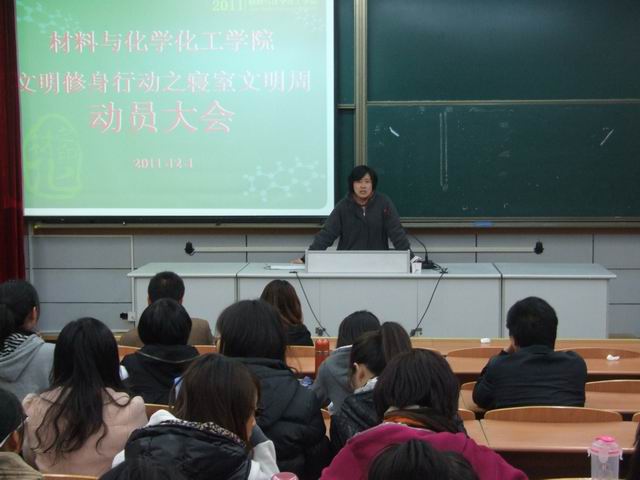 大会伊始,管庆江老师首先说明了此次大会的目的,并指出目前学生寝室存在的一些问题,针对当前下沙高教园区治安问题,管庆江老师提醒在场的同学们注意人身与财产安全。然后,单蔚老师上台向同学们从寝室卫生、用电安全、文明修养等方面做了重点动员,并就寝室文明周考虑到毕业生和研究生寝室的特殊性,单蔚老师依旧希望同学们不放松文明寝室的建设。有关于人身安全的问题,她还风趣地提到:“在四号实验楼做实验的的同学不能单独回寝室,男同学要充分承担护花使者的使命,护送女同学回寝室,但送到寝室楼下就可以了。”