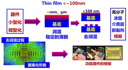 高分子复杂薄膜的稳定性问题存在于我们日常生活的方方面面,比如润滑剂在汽车发动机上形成的油膜以及硬盘磁头上的高分子薄膜,再比如人眼的泪膜润湿眼角膜并通过眨眼将灰尘冲刷掉。在上述例子中,人们希望液体膜润湿基底,即希望液体膜稳定。但要实现这一目的,我们需要反向研究去润湿行为即液体膜的不稳定性。另一方面,近年来利用去润湿获得的组装图案在微电子器件等方面展现了极大的应用潜力,也导致有关去润湿方面的研究受到广大学者的广泛关注。因此,对去润湿行为开展研究,不仅有助于理解其本质及产生根源,而且对全面控制这一行为(如通过抑制去润湿的发生而达到润湿的目的)具有重大意义。事实上,液体膜的稳定性问题已经成为多个学科的关键问题,近15 年来在加工(比如涂料工业、微流加工技术)、地质物理(熔岩流的铺展过程)和生物物理(泪膜的破裂等)等领域已有数十篇综述文章涉及到这一凝聚态的基本物理问题。
