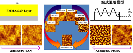 1.     我们设计了PMMA/SAN(即聚甲基丙烯酸甲酯/苯乙烯-丙烯腈无规共聚物)的模型体系,通过微量添加的方式调控薄膜厚度方向的组成梯度,进而实现对薄膜稳定性的有效控制。研究结果发现:纯PMMA和纯SAN薄膜经过长时间的退火均保持稳定,表明上述两种薄膜热力学上浸润氧化硅基底。在GISAXS方法确定共混物在该温度下相容性的基础上,于PMMA中加入微量SAN后,薄膜保持稳定,只是出现了轻微的起伏;而在SAN中加入微量PMMA后,由于PMMA向基底迁移,导致薄膜发生了显著的去润湿。在上述过程中,PMMA与基底(硅片)较强的相互作用扮演了重要角色。一方面,该作用导致PMMA向基底方向迁移,形成了薄膜厚度方向上的组成梯度,这是去润湿发生的必要条件;另一方面,PMMA与基底较强的相互作用抵消了构象熵的损失,造成PMMA中添加少量SAN的薄膜保持稳定。因此,我们的研究工作以较直接的方式验证了该理论的合理性,同时,提供了一种控制薄膜稳定性的新策略:即加入相容性组分,该策略可以有效避免传统添加剂团聚的问题。