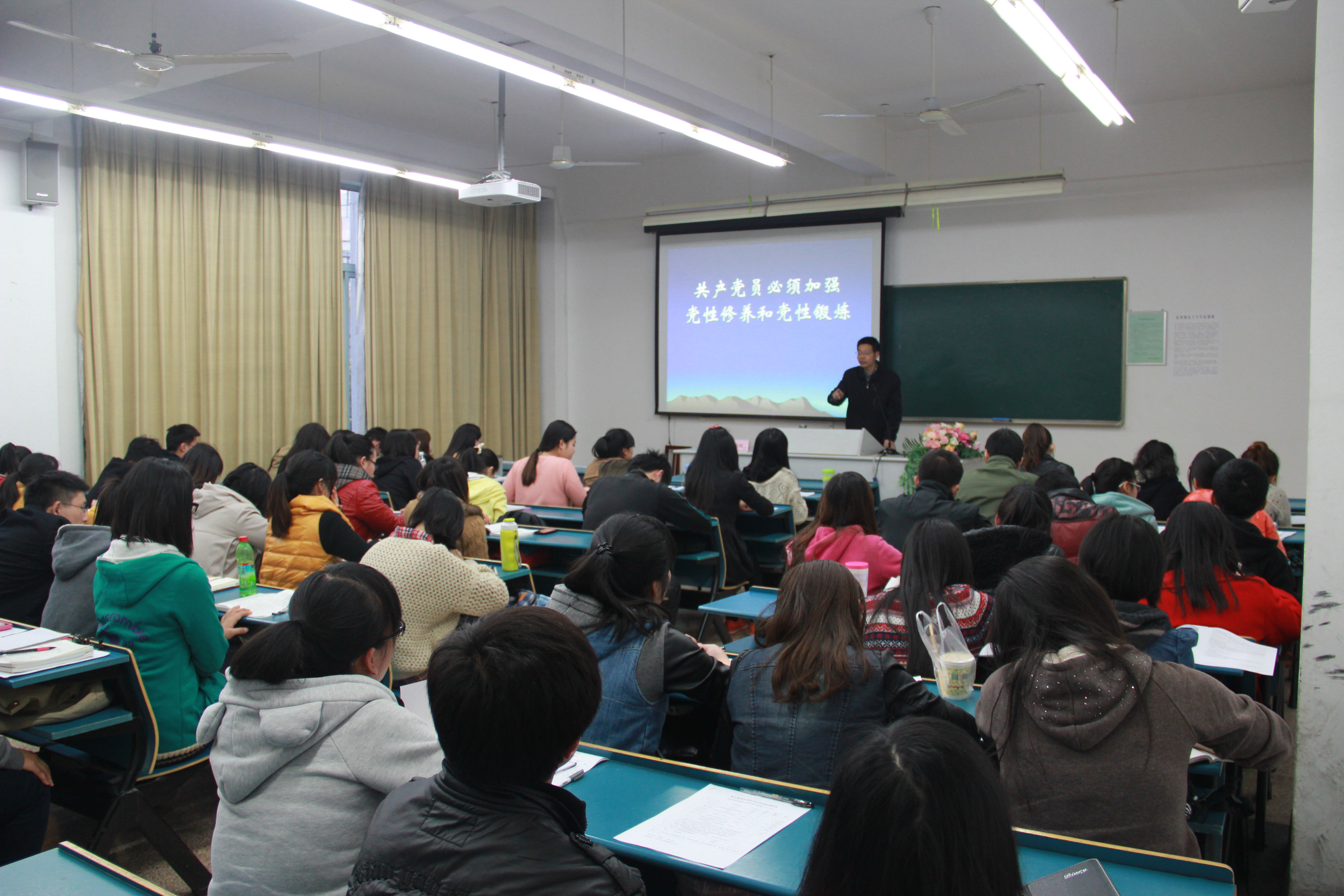 严柏炎老师针对当代大学生存在的问题,对同学们提出了四条入党标准:自觉进行理论学习;学习态度端正、学业成绩优良;清楚认识和了解自身优缺点;乐于助人、乐于奉献、乐于为集体服务。“入门以增长智慧,出门以服务贡献社会”,严老师鼓励学生从专业学习转向综合学习,从“学校学习”发展为“社会学习”,学会从多方面提升自身修养。随后,严老师围绕“什么是共产党员的党性修养”、“为什么要加强党性修养”、“共产党员要加强哪些党性修养”、“共产党员如何进行党性修养”四个方面与在座同学进行了深入探讨。党性修养一直是我党优良传统,作为一名预备党员,必须要学会以理论修养为基础、政治修养为方向,从政治思想、理想信念、宗旨作风、组织纪律、道德品质以及知识技能方面加强个人党性修养,通过不断学习、实践和总结形成坚强的党性,发展自身先进性。