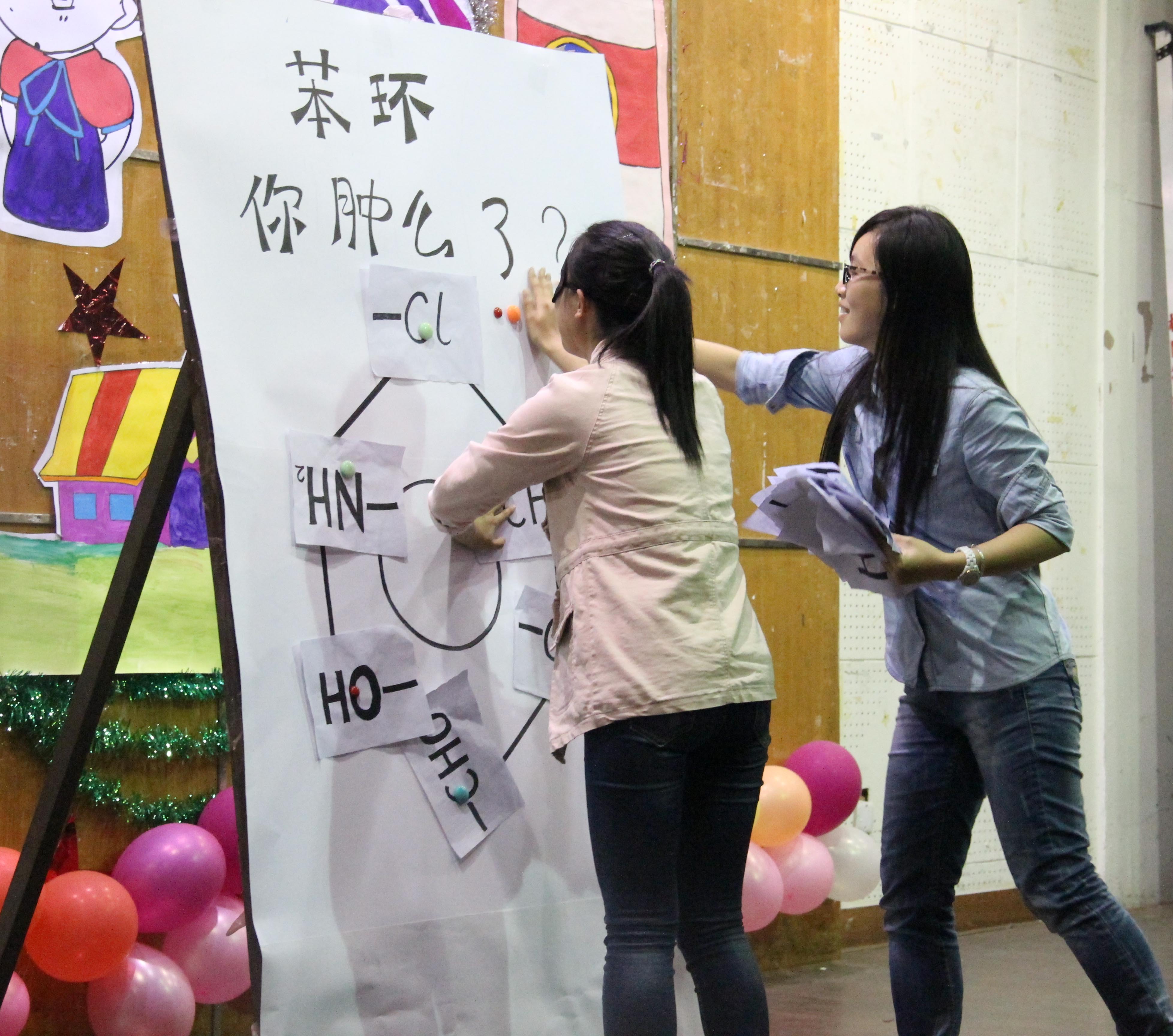 在游戏环节“苯环你肿么了”,由两人一组进行比赛,一人蒙眼对着“苯环”,另一人根据大屏幕给出的苯的衍生物的命名进行语言引导蒙眼者将面前的纸质基团贴至对应位置,考验了参赛者之间的默契和团队合作精神。在短短的一分钟内,也有很多寝室顺利完成了任务。