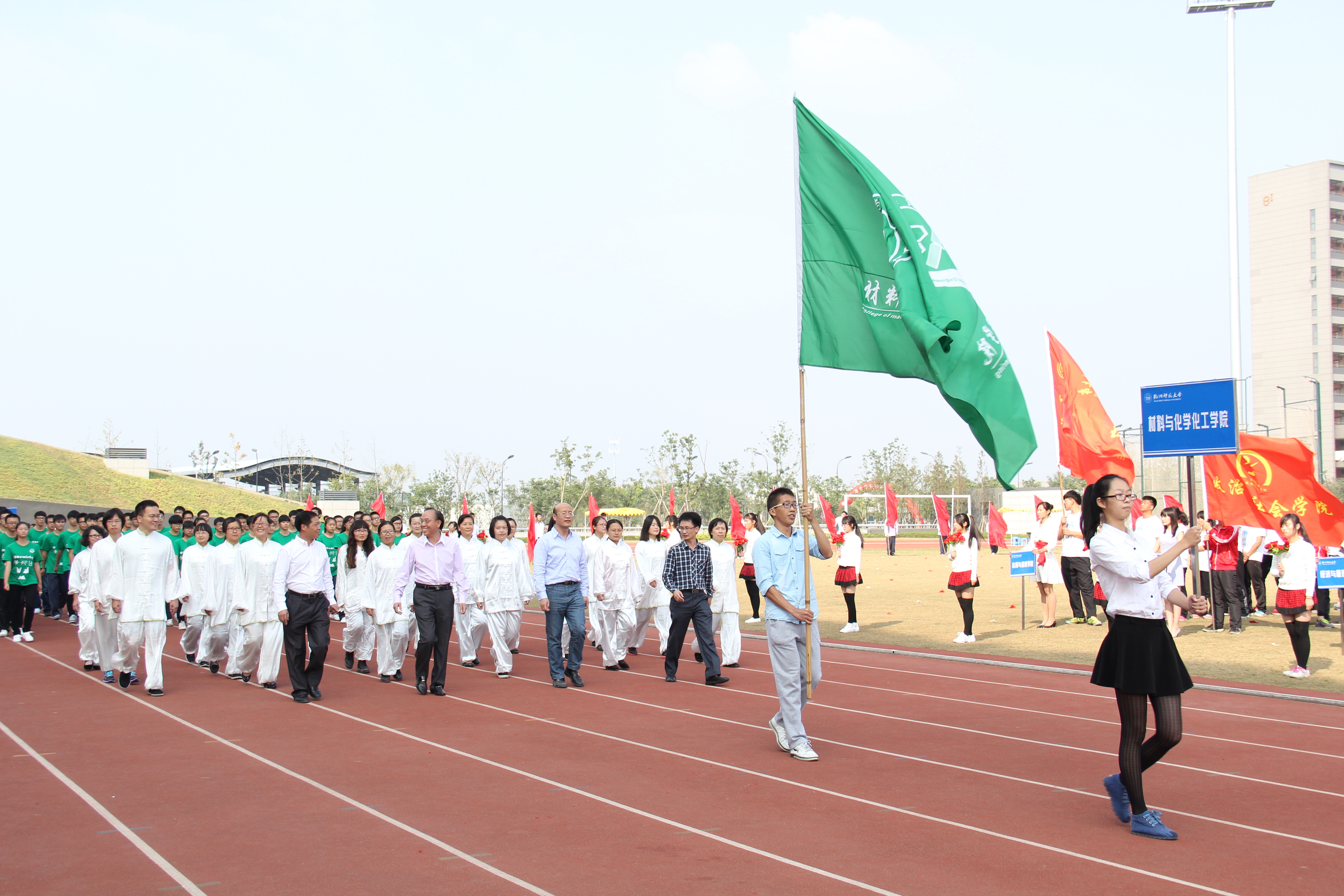 师生方阵精彩亮相。他们各个朝气蓬勃,精神抖擞,凭借具有学院特色的苯环队形打出精彩绝伦的一套特色拳。“材化学子,争创一流,团结奋进,共创辉煌”,声声遒劲有力的口号,激荡在会场上空,展现着大师兄影视