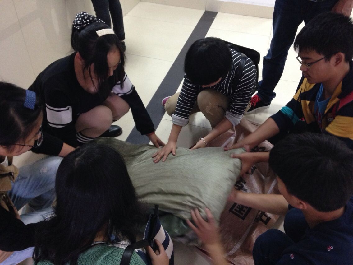 怀揣着与阳光媲美的热情,青协的工作人员将所有用品搬到邮政局,一路上所有人都说着对内蒙古小朋友的祝语。在邮局内,青协部长张倩云在寄件单上认真地写下邮政编码,地址,联系方式等。而干事们则协力把所有用品装进寄货袋里并用针缝好,在仔细检查无误后,把寄货袋交给邮政局工作人员,为内蒙古小朋友寄去了材化学生沉甸甸的爱心和希望。