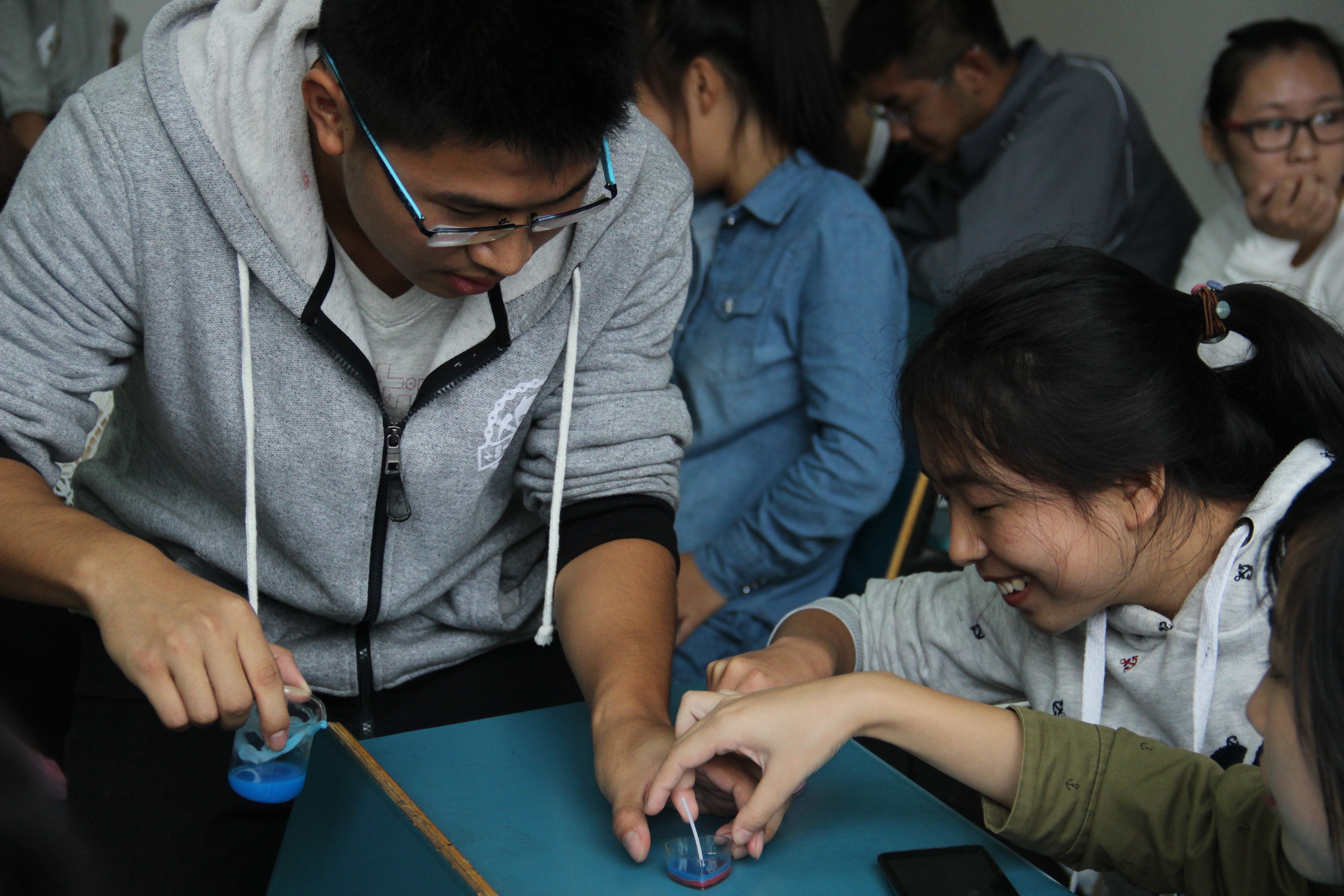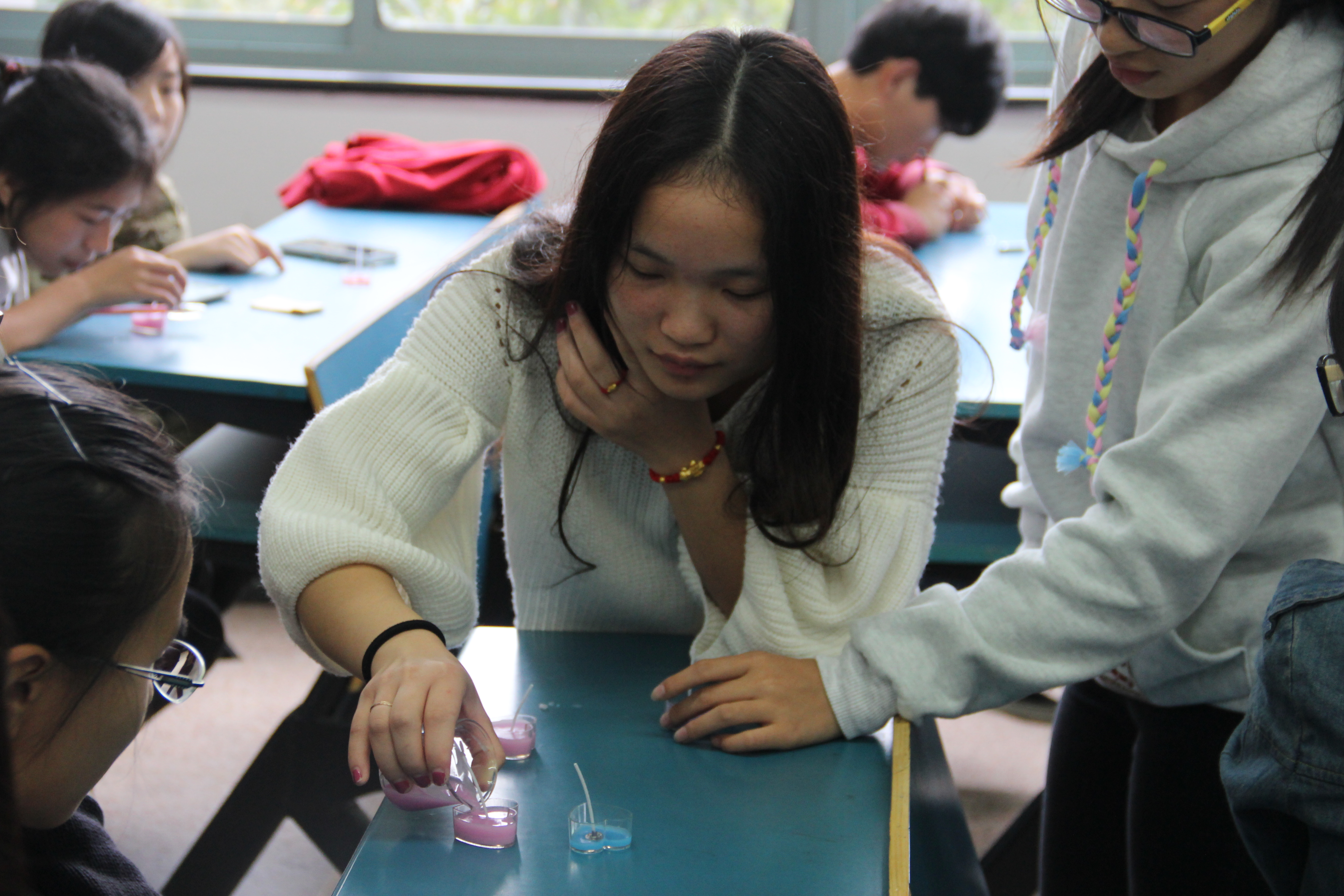 在发言之后,现场开始了彩色蜡烛的制作,这个环节也将大会活跃的气氛推向了高潮。在制作过程中,工作人员耐心地为会员们熔蜡,而会员们也积极地做着属于自己的彩色蜡烛,还有一些不畏挑战的会员选择了制作难度较高的彩色火焰蜡烛。各色的蜡烛、各色的火焰,让枯燥的生活变得更加美丽。在会员们的热情参与下,犹如彩虹般的层层颜色的出现宣告了本次活动的成功,蜡烛的炫彩与同学们的笑脸构成了贵之烯最美的画面。