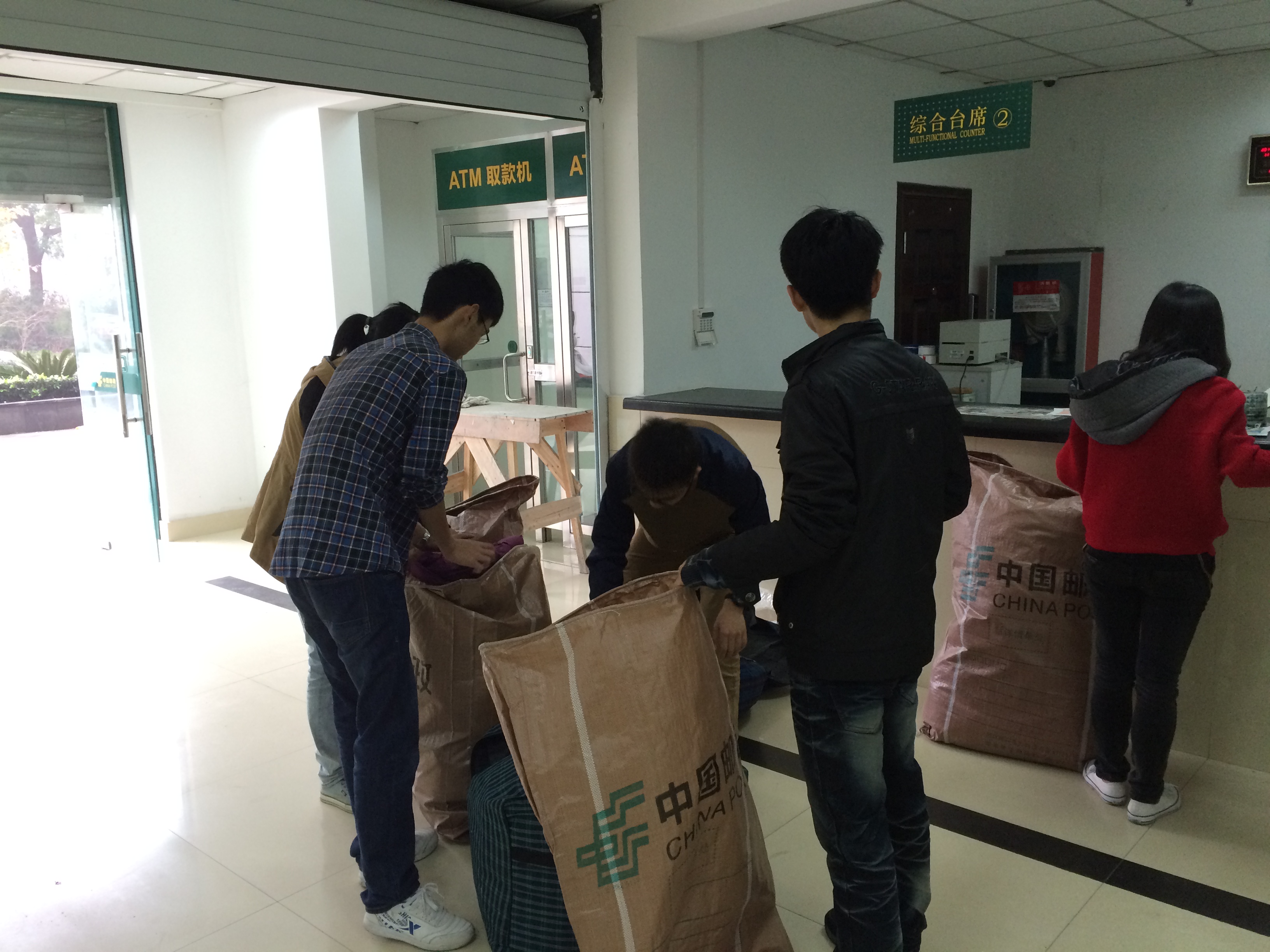 青年志愿者协会干部干事齐力将从东东城多蓝小区募捐来的衣服搬运到学林街邮政局,并寄往内蒙古,为贫困地区的人们奉献自己的一份力量。整个“爱的邮递员”活动就此正式落幕。