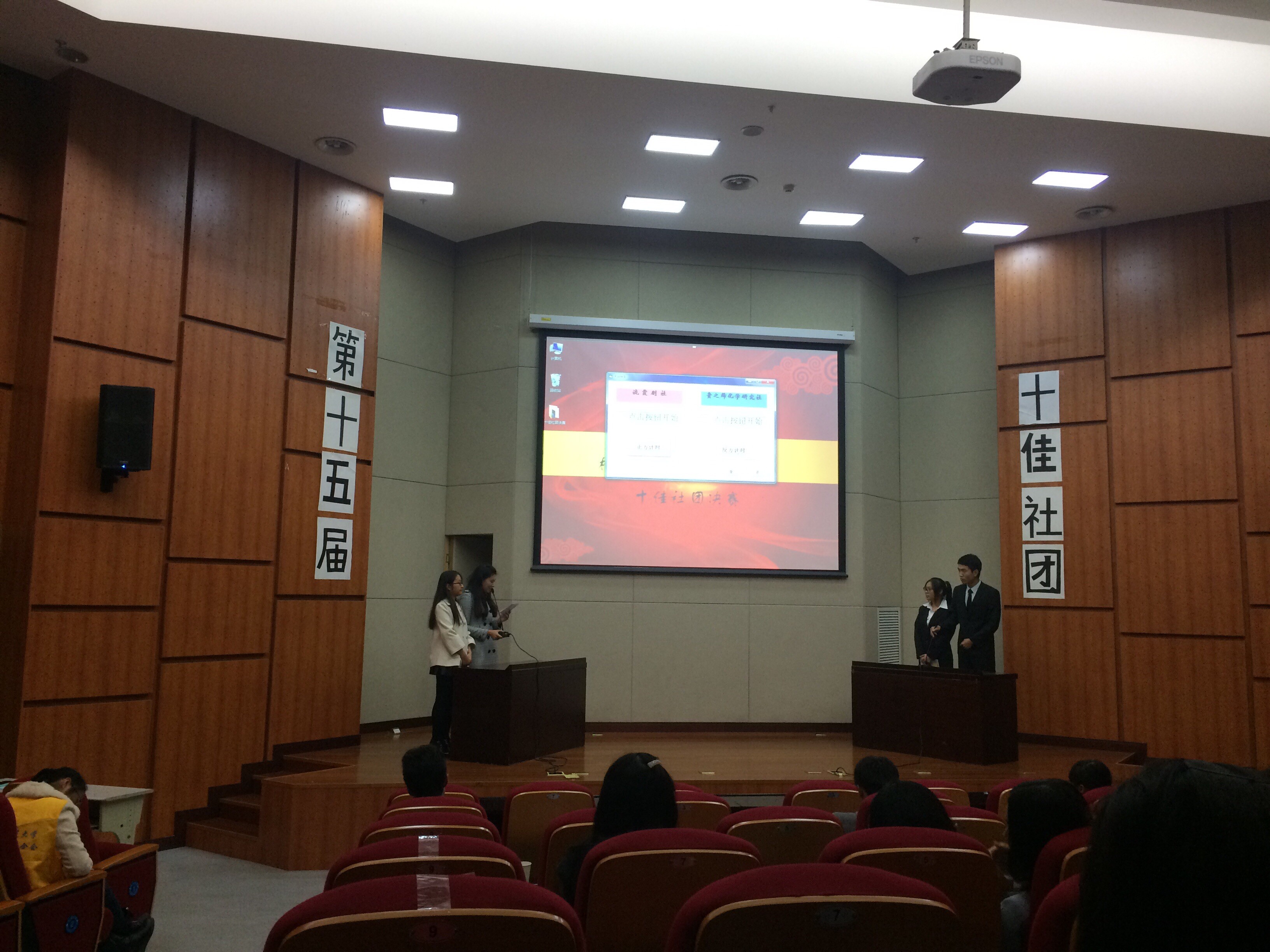 在本次比赛中,进入决赛的十二个社团抽签分为六组,每组需完成三个环节:首先,每个社团通过VCR展示各自的社团文化;其次,同组的不同社团代表互相提问答辩,并进行简要总结;最后由评委提问打分,评出十佳社团。
