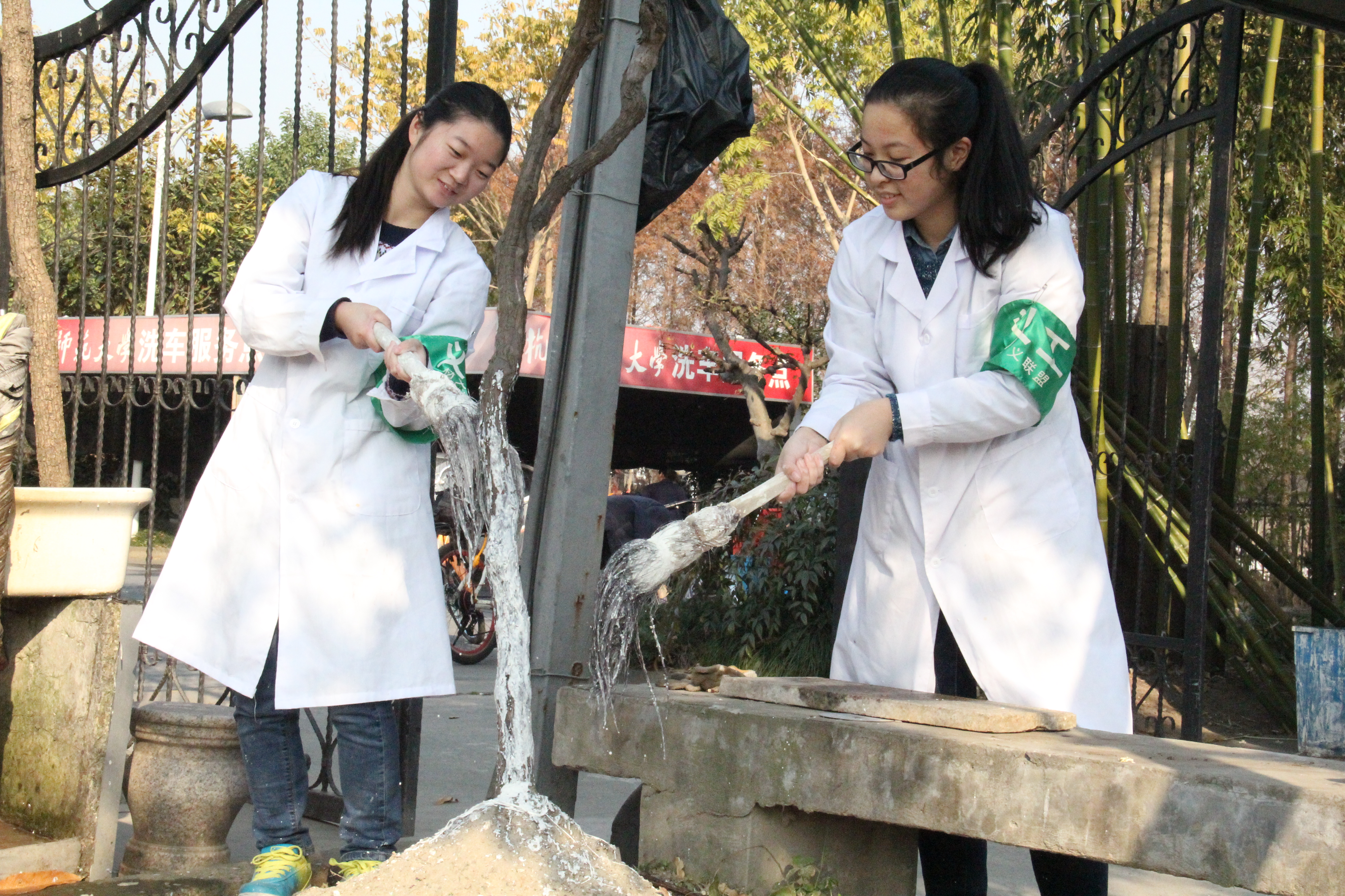 义工们身着白色实验服,佩戴材义联盟绿色袖章,在后勤朱师傅的带领下,很快就掌握了树木刷漆相关动作的要领。一个男生和两个女生为一组,男生负责提桶,女生负责刷漆。义工们热情高涨地为近百棵树涂上白漆。活动有条不紊地进行着,刷漆任务也越发顺利。看到一排排的白色树漆,义工们在体验后勤人员辛苦的同时,真正感受到辛勤劳动的意义与价值。