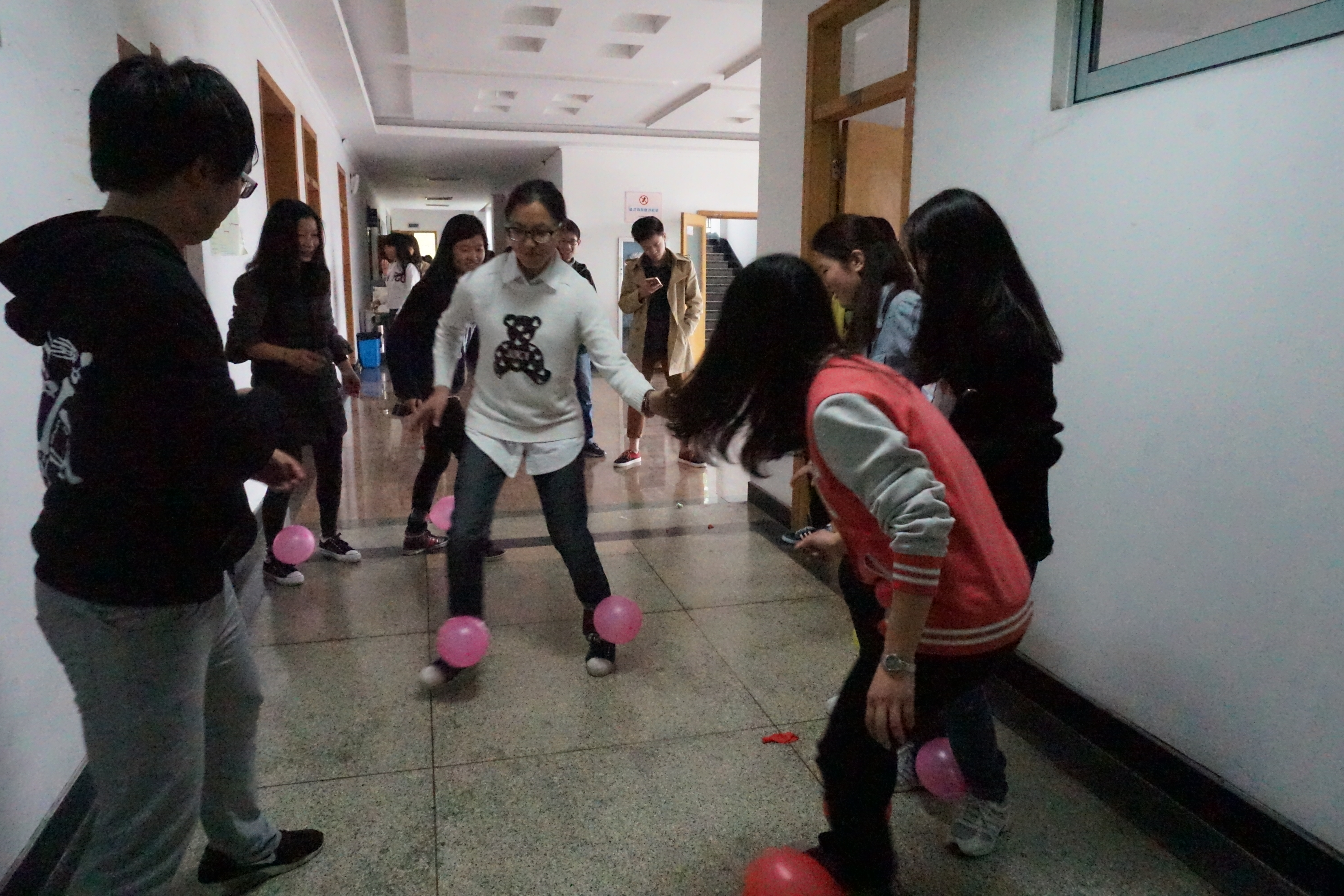 在负责人员简单介绍游戏规则和注意事项之后,活动正式拉开了帷幕。活动由两个环节组成。第一环节是参赛人员从工作人员拿到线索卡,分别在6个“藏宝点”:A楼213教室、情人坡、艺术楼一楼、大操场、体育馆后门和风雨篮球场等地按照规定路线完成游戏。夹玻璃球、寻找“真凶”、过目不忘、跳长绳、你画我猜和精准打击6个游戏调动起了现场的氛围。第二环节的踩气球大赛在激烈的竞争下拉下帷幕。最后,制药141的三个女生,赢得了最后的大奖。活动也在欢声笑语中划下句点。