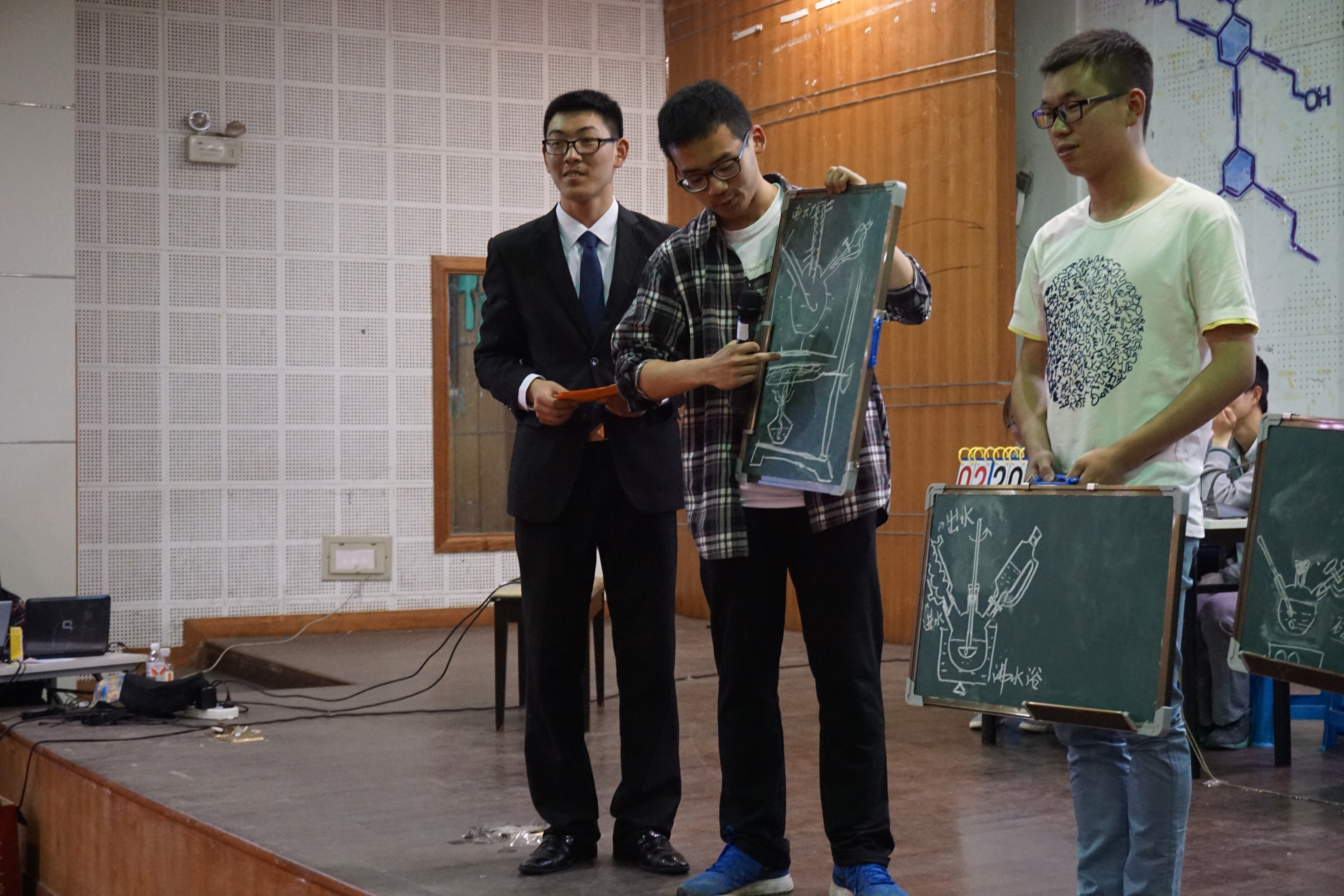 本次决赛共四个环节,在必答题环节中,四个小组实力相当,难分伯仲。这也使得各组卯足了劲,在抢答环节中竞争“愈演愈烈”。实验操作题成了这场比赛的分水岭,“时代光华”小组和“高疯子”小组以高出别组40分的优势暂时领先。而“高疯子”组在最后的选做题中,继续发挥出色的表现,一举夺下当晚冠军头衔,“时代光华”队和“Clausuis”队则分别夺得亚军和季军。此外,评委老师和出席嘉宾也为前期获得“理论知识之星”和“实验操作技能之星”的同学进行了颁奖。