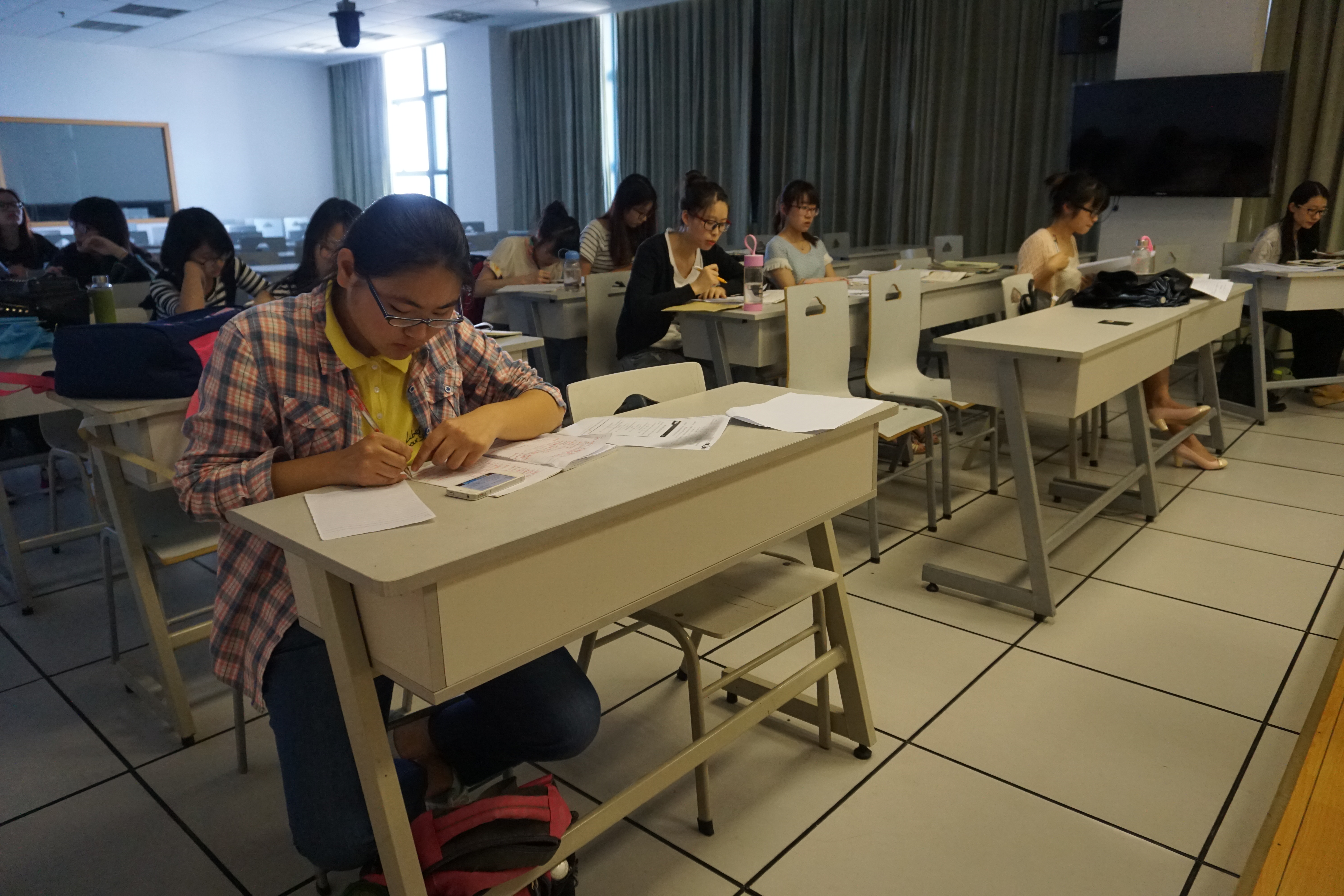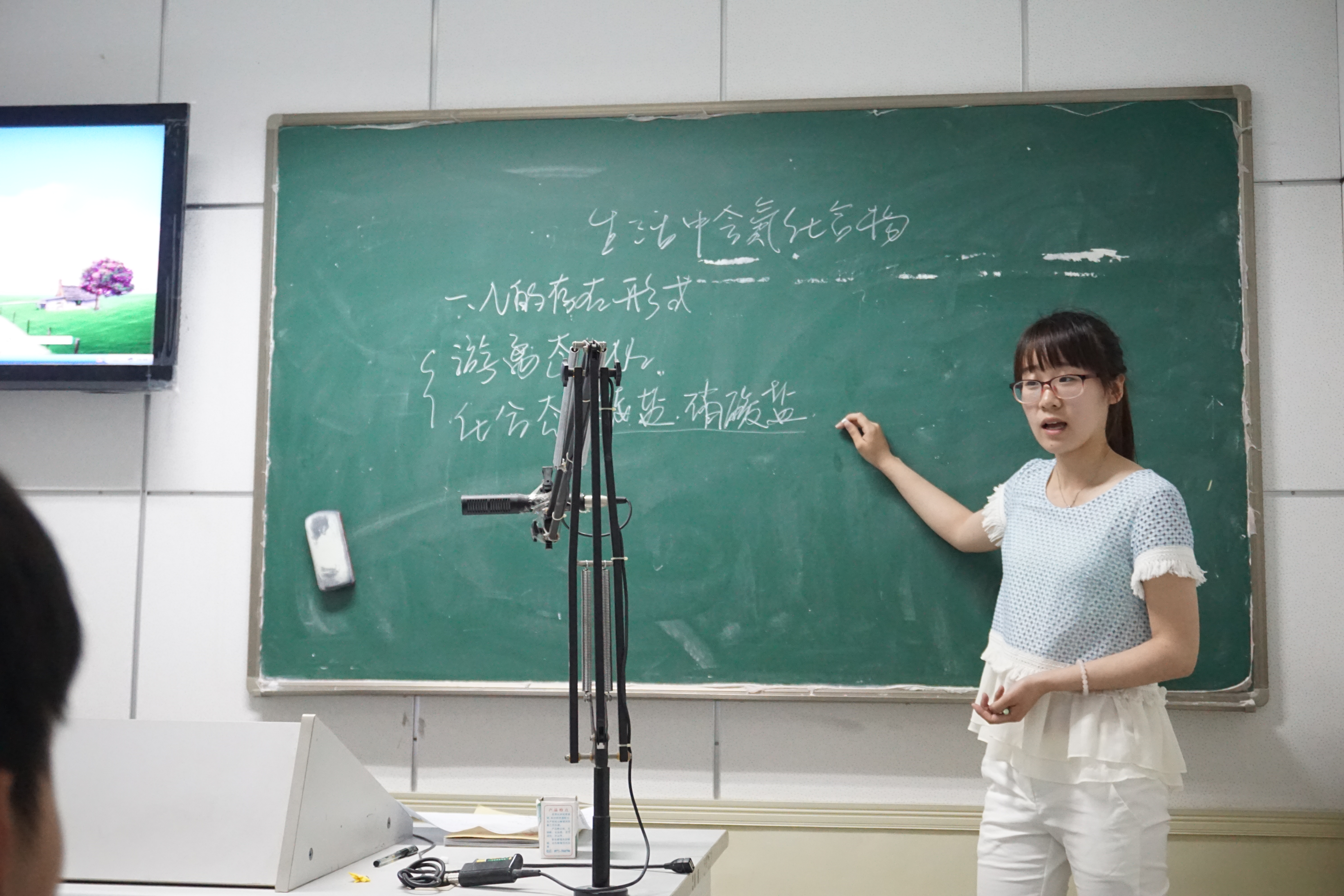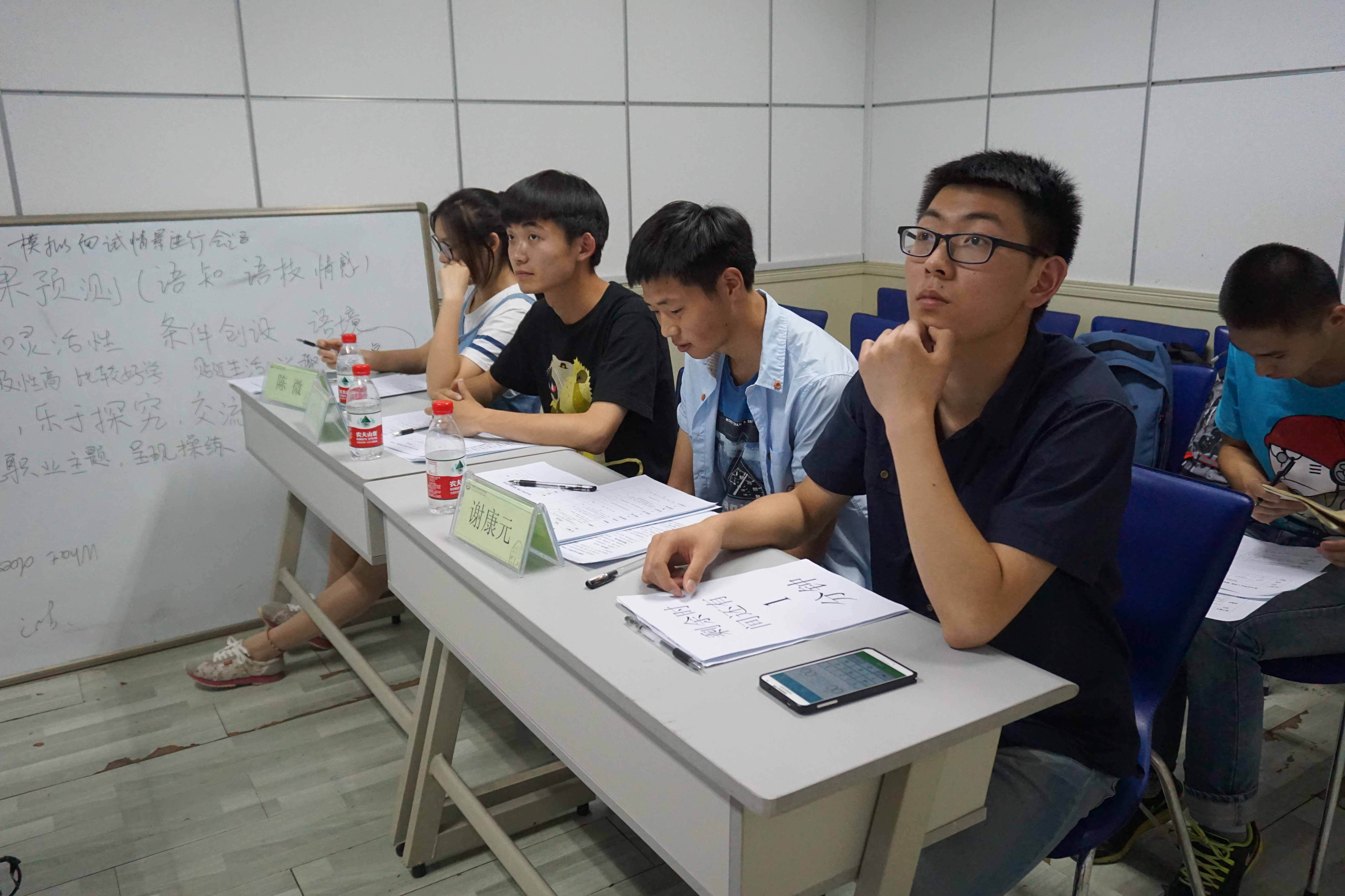 比赛内容为说课与模拟上课两部分,选手从给定的教材中随机选取一段教学内容。在一小时的准备时间后,按照说课5分钟,课堂教学15分钟的形式模拟授课。此活动检验的是学生的反应能力、教学艺术、语言运用能力、板书设计等一系列教学实践能力。选手们跃跃欲试,拿到试题纷纷预演起来。比赛过程中,选手们在讲台上镇定自若,不慌不乱地解说着课程的重点与难点。场下评委认真细致地观察着选手在台上的表现。