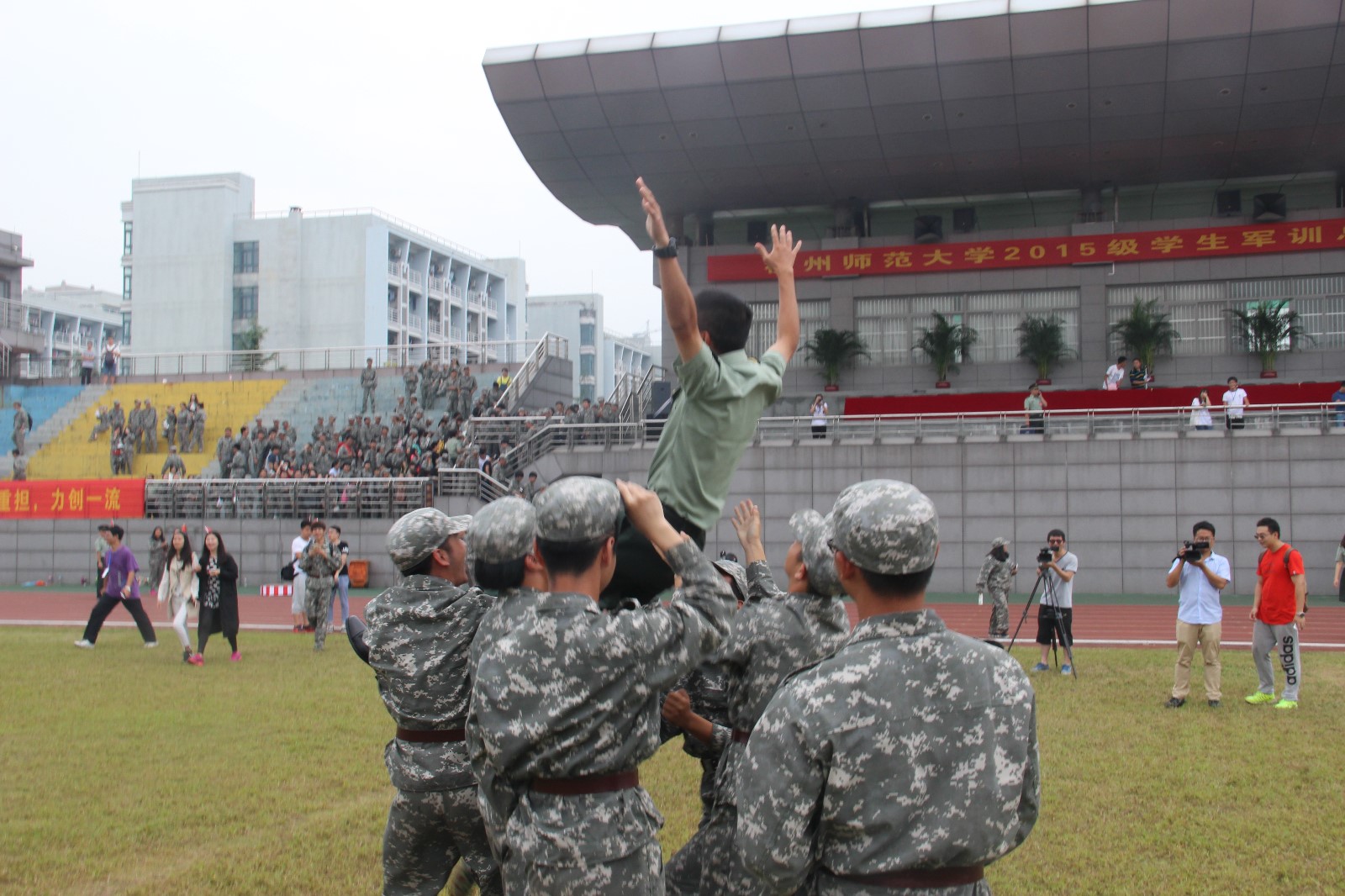9月20号8:00,我校下沙校区的全体新生和教官在运动场上举行了2015级新生军训阅兵大会。校党委副书记王利琳、军训师师长暨副校长何俊、二团团长张显和各学院有关领导均出席了此次阅兵大会,并由二团团长主持了此次大会。