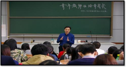 2016年4月13日下午一点半,长兴实验中学校长沈永林老师以他自身传奇经历给我们化学131班讲授青年教师需要什么样的品质,要做到什么。