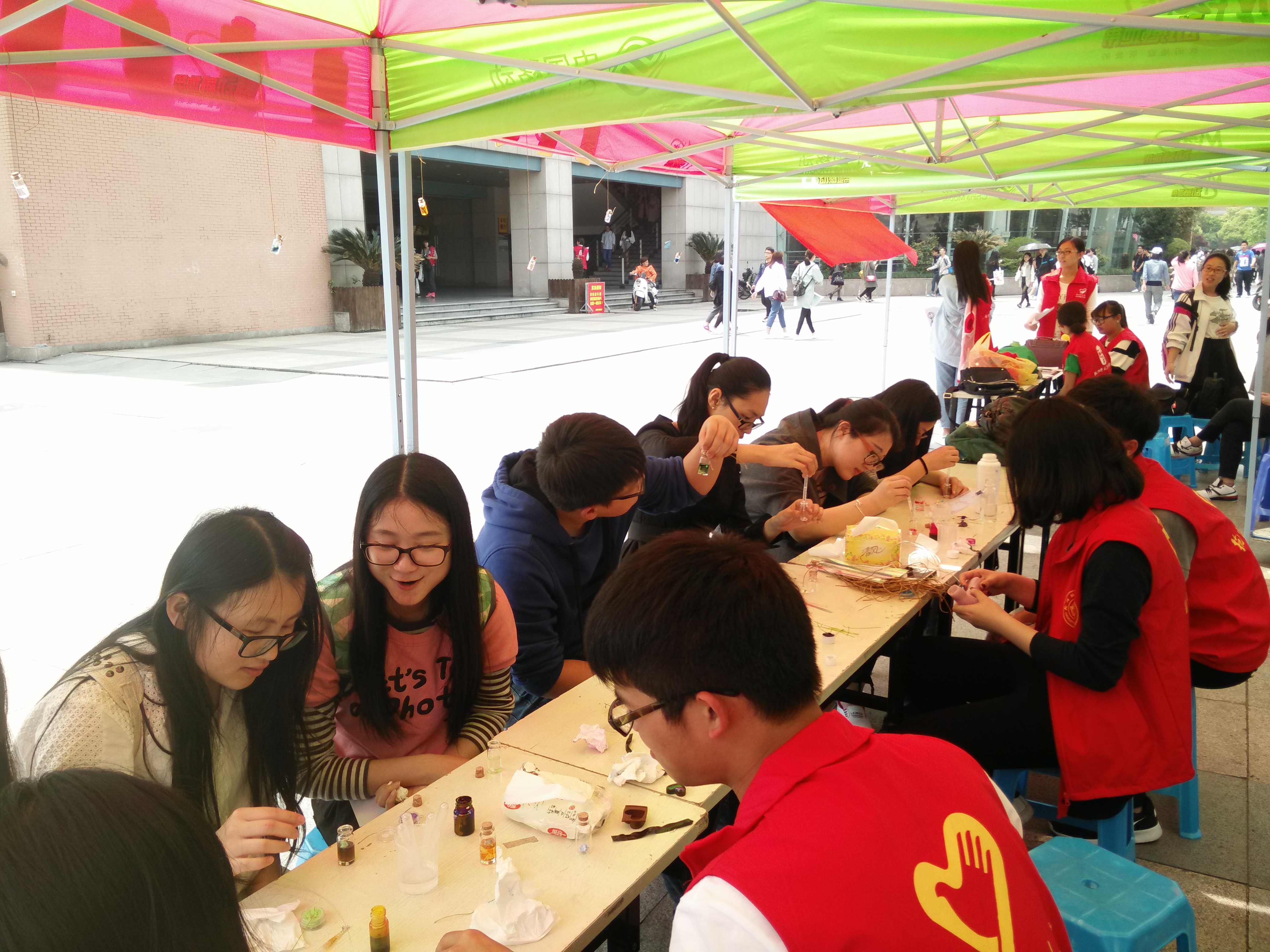 活动还未开始,便有不少同学被标题以及帐篷上悬挂的精美成品吸引,争先恐后地在旁围观。志愿者一边忙着调制凝胶,一边将制作方法耐心仔细地向同学们说明。准备就绪后,同学们便迫不及待地着手制作起来。随着活动的进行,被吸引前来DIY的同学越来越多,现场气氛相当热烈。在同学们的精心制作下,小巧可爱的装饰品、各色颜料加上荧荧闪粉就变成了一个又一个晶莹剔透的心语瓶。将近一个半小时后,此次活动在同学们的恋恋不舍中落下帷幕。(文/任楠)