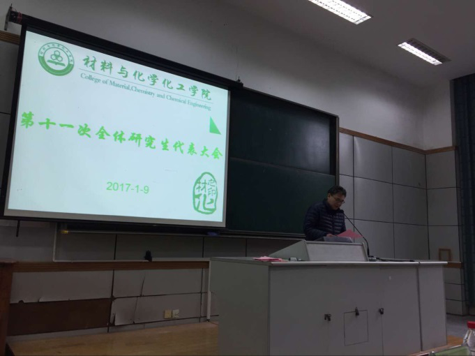 会上,副院长王园朝老师向大会的召开致辞,他充分肯定了研究生干部所做的各项工作以及为学院所注入的活力。副书记江齐里在肯定学生工作的同时,也对同学们加强文明寝室建设提出了建议,希望共创和谐寝室,发扬材化特色。校研会代表唐杰就本次大会的召开表示了热烈的祝贺,并以自身经历鼓励同学们参与研会工作,为同学服务。会上对2015-2016年度学院研究生工作先进个人进行表彰。