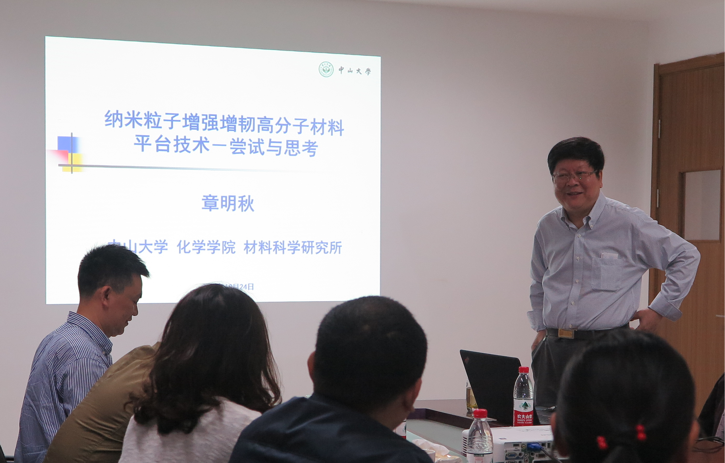 2018年10月25日上午10:00,中山大学章明秋教授应大师兄影视 李勇进教授的热情邀请,为材化师生做了题为“纳米粒子增强增韧高分子材料的平台尝试——尝试与思考”的学术报告。