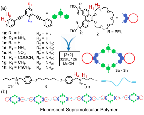 由于结构中引入非共价相互作用赋予了结构多样性和对微环境变化的刺激响应性,荧光超分子聚合物在超分子化学与荧光材料等领域中受到了越来越多的关注。除此之外,荧光超分子聚合物还拥有由生色团自身的发光特性,使得其在为生物成像、化学传感、发光材料等领域中具有广泛的应用。论文中作者首先利用配位驱动自组装的方法,高效合成了一系列冠醚修饰的金属大环(产率高于90%)。然后,作者通过改变大环中吡啶配体的官能团,实现了金属大环的荧光从蓝光到红光的调控。最后,作者利用冠醚-二级铵盐的主客体相互作用,制备了一系列荧光可控的超分子聚合物。因超分子聚合物的形成,金属环的排列变得更为有序,从而降低了分子的堆积,减小了自淬灭的影响。相较于金属大环,超分子聚合物的溶液及固态的发光效率均得到了明显提高。为此,作者将具有较高发光效率的黄光超分子聚合物涂膜到蓝光LED发光材料上,成功地制备了一种具有白光发射的LED材料,拓宽了光学器件的发光区。
