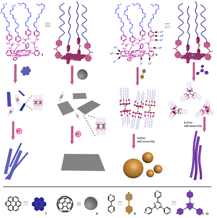 可控自组装对于超分子材料的制备和自组装体系多样性的呈现具有重要的现实意义。超两亲体在纳米结构的构筑等方面具有独特优势,但在具有不同形状和尺度的纳米材料多样性构筑方面仍存在挑战。针对这一挑战,他们设计、制备了一种单侧4条四甘醇链取代的两亲卟啉与金属卟啉分子,利用它们与晕苯、C60、4,4’-联吡啶、2,4,6-三吡啶基-1,3,5-三嗪、Cl‒等的分子识别或配位作用构建了一系列具有形状和尺度各异的超两亲体,进而聚集形成纳米球、纳米棒、膜、胶束、囊泡、微米线等丰富形貌的组装体,实现了超分子组装的多样化调控。