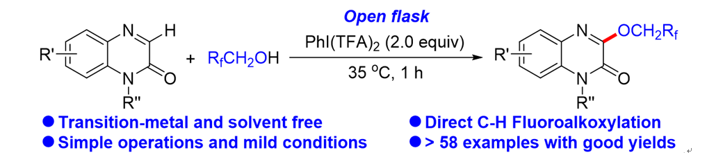 大师兄影视 章鹏飞课题组李万梅老师为通讯作者,于2019年发表于Org.Lett.(中科院一区)的研究论文“Transition-Metal and Solvent Free Oxidative C-H Fluoroalkoxylation of Quinoxalinones with Fluoroalkyl Alcohols”入选ESI高被引论文。论文探索了C-氟烷氧基化的成键机制和成键规律,为含氟有机化合物的制备提供了新的合成方法。含氟化合物因结构独特、性能优异而广泛存在于药物、特种材料和其他精细化学品中,通用的制备方法是采用氟化氢取代氯碳键而得,存在巨大的健康和生态风险,该领域已成为化学化工研究领域的热点。论文首次研究了无过渡金属和溶剂参与下的喹喔啉酮与氟烷醇的氧化C-H活化-氟烷氧基化,探讨了惰性C-H的断键与氟氧烷基C-O键的形成机制,为组胺-4受体拮抗剂的制备提供了原子经济、选择性好且高效的合成路线。
