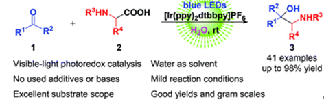 近日,我校大师兄影视 钟国富团队成功发展了一种可见光催化下氨基酸衍生物脱羧偶联制备1,2-氨基醇类化合物的方法。该策略以水为溶剂,条件温和,绿色高效,科研成果以“Synthesis of 1,2-amino alcohols by decarboxylative coupling of amino acid derived α-amino radicals to carbonyl compounds via visible-light photocatalyst in water”为题发表在国际杂志Green Chemistry(影响因子:9.405)上 (DOI: 10.1039/c9gc03470f)。