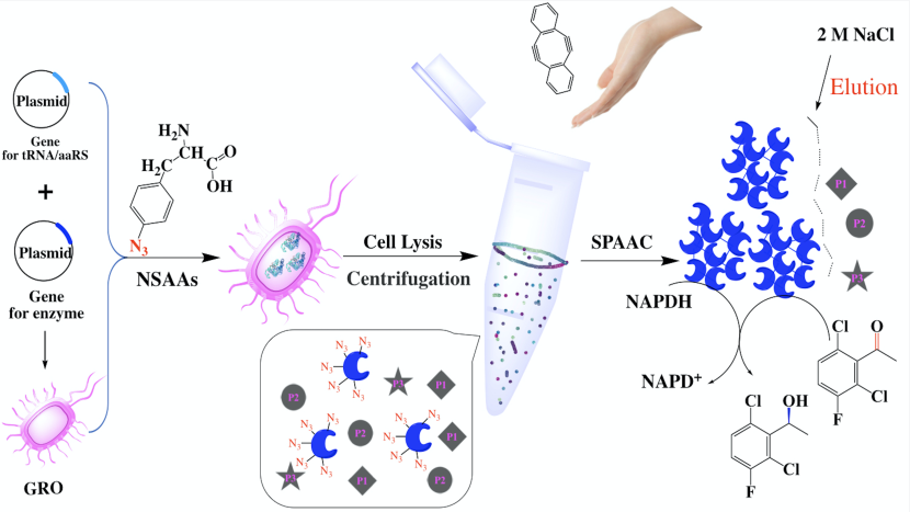 在传统共价固定中,当使用交联剂如戊二醛时因无法控制的随机反应和有害连接,这可能会导致酶构象变化并由于破坏和掩埋的活性位点而降低酶的活性。因此,关于多点共价固定化和交联酶聚集体,如何精准控制酶和载体之间的精准共价键数目、连接位点位置以及连接方式,一直是工业生物催化领域的难题。非天然氨基酸的掺入修饰为这一问题的突破提供了希望。