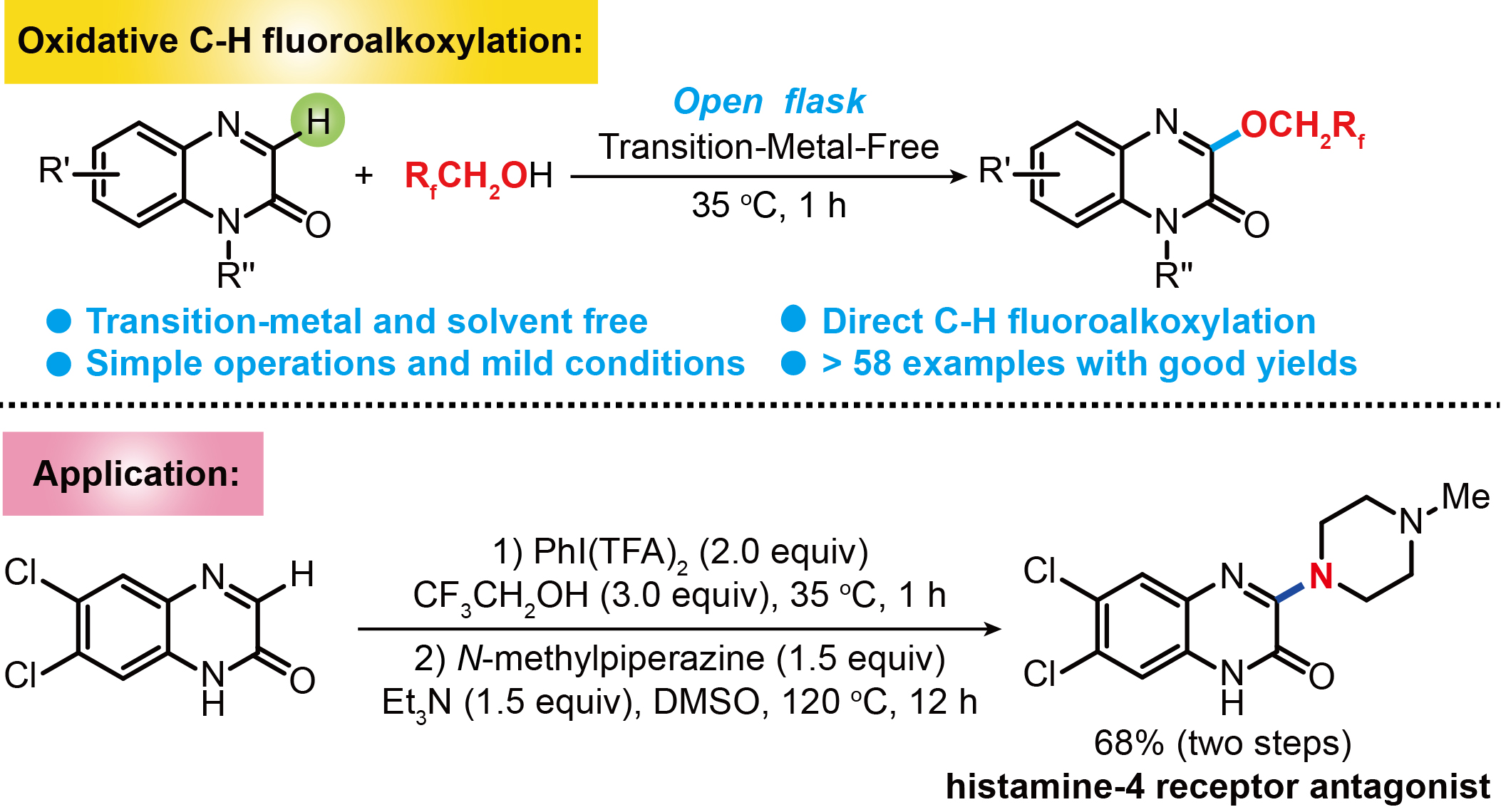 大师兄影视 章鹏飞课题组李万梅老师为通讯作者,于2019年发表于Org.Lett.(中科院一区)的研究论文“Transition-Metal and Solvent Free Oxidative C-H Fluoroalkoxylation of Quinoxalinones with Fluoroalkyl Alcohols”入选ESI高被引论文。论文探索了C-氟烷氧基化的成键机制和成键规律,为含氟有机化合物的制备提供了新的合成方法。含氟化合物因结构独特、性能优异而广泛存在于药物、特种材料和其他精细化学品中,通用的制备方法是采用氟化氢取代氯碳键而得,存在巨大的健康和生态风险,该领域已成为化学化工研究领域的热点。论文首次研究了无过渡金属和溶剂参与下的喹喔啉酮与氟烷醇的氧化C-H活化-氟烷氧基化,探讨了惰性C-H的断键与氟氧烷基C-O键的形成机制,为组胺-4受体拮抗剂的制备提供了原子经济、选择性好且高效的合成路线。