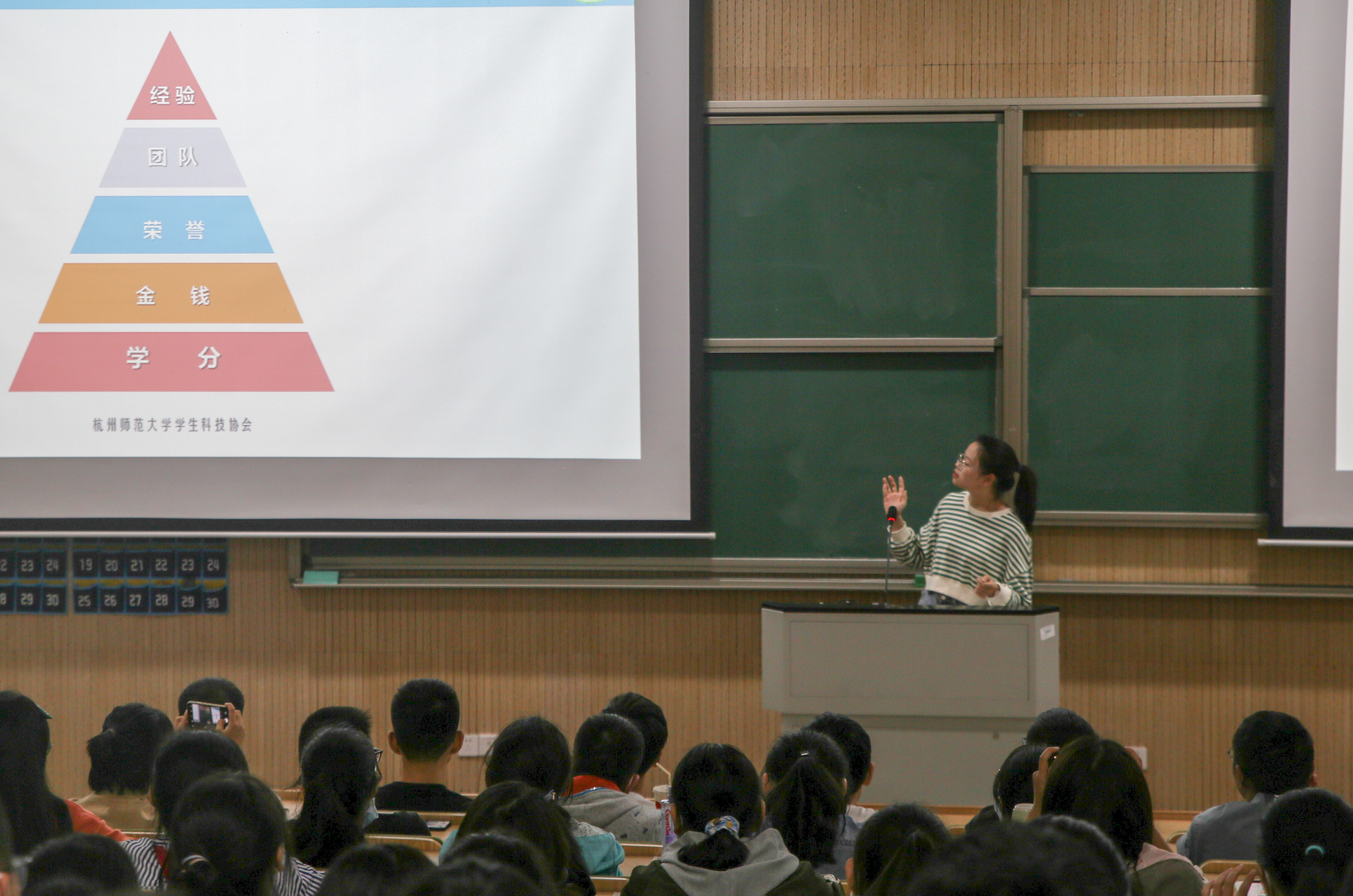 宣讲伊始,李晨蕊向同学们详细地介绍了浙江省新苗人才计划、星光计划以及星光讲堂等活动,随后杨震滔就挑战杯、本创和国创等相关内容作了深入介绍,并着重强调了科研活动在大学生活中的重要性。之后欧阳娅妮向学弟学妹们分享了自己的科研经验,讲述了自己开展科研活动的心路历程,帮助同学进一步了解科创活动。