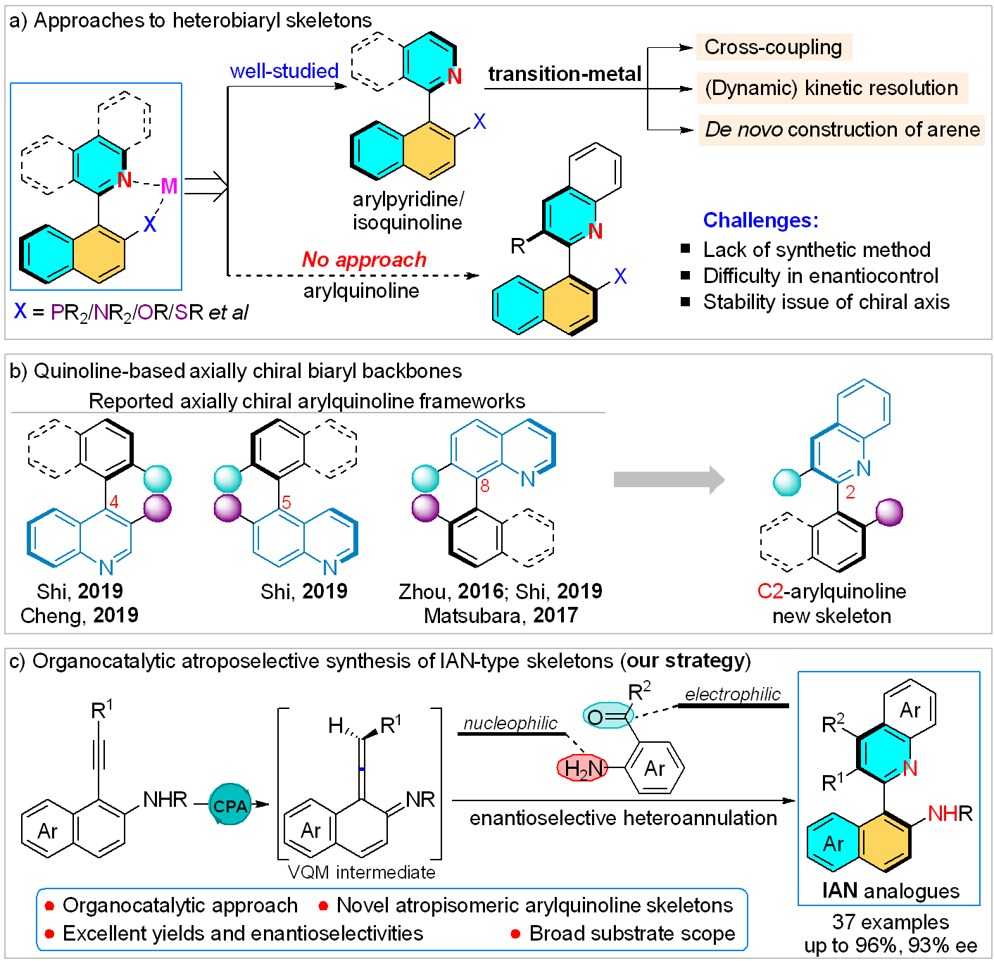 众所周知,2-芳基吡啶(异喹啉)类轴手性骨架是众多优势手性催化剂和配体的核心结构单元, 然而其高对映选择性构建却面临着许多挑战。例如,已见报道的合成方法主要依赖于过渡金属的参与,而基于有机催化的合成策略却尚未实现;其次,目前该类轴手性骨架中含氮芳杂环大多局限于吡啶、异喹啉结构,而对于含喹啉等其他杂环的类似轴手性骨架的报道却极少。因此,为了不断探索新型的潜在优势轴手性骨架,大师兄影视 钟国富教授团队与南方科技大学的谭斌教授合作,设计了一类新型的2-芳基喹啉轴手性骨架,并首次提出通过有机催化策略,利用手性磷酸(CPA)催化下芳基炔烃类化合物与邻氨基氟代苯乙酮的不对称串联环化反应来实现目标IAN类轴手性骨架的不对称构建。该方法具有良好的底物适用性,在温和条件下以优秀的收率和对映选择性快速高效地合成了一系列新型2-芳基喹啉轴手性化合物。同时,通过克级放大实验以及一系列的衍生化反应,体现出该研究具有进行大规模制备以及在开发新型手性催化剂和配体方面广阔的应用前景。该工作是首例通过有机催化策略不对称合成IAN类轴手性化合物的报道,为相关轴手性骨架化合物的高效构建提供了一种全新策略。