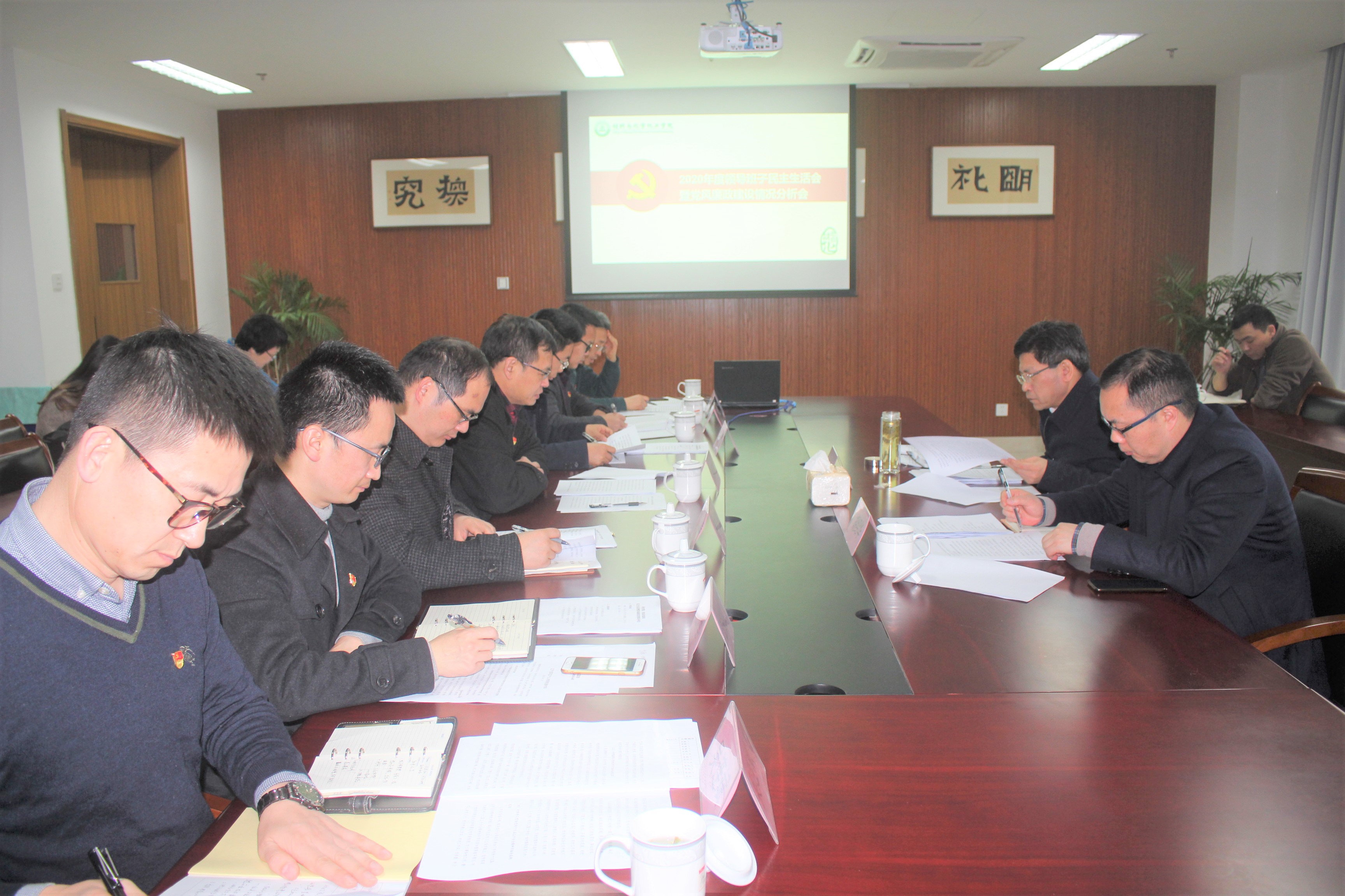 会上,章鹏飞院长介绍了本次民主生活会的会前准备和意见征求等情况,并代表班子围绕学懂弄通做实习近平新时代中国特色社会主义思想、坚持和加强党对高校的全面领导、履职尽责担当作为、学习贯彻党的十九届五中全会精神、落实全面从严治党责任等5个方面和征集到的关于建设发展各方面意见建议作了领导班子对照检查报告。随后班子成员依次进行个人对照检查报告,深刻自我批评,对自己思想和工作上的薄弱环节进行剖析。班子成员间开展了相互批评,围绕学科融合发展、管理水平提升、队伍建设稳定等问题进一步统一了思想、加深了认识。学院党委副书记、纪委书记江齐里对学院过去一年开展党风廉政建设的情况作了分析汇报,班子成员分别作履行“一岗双责”发言。
