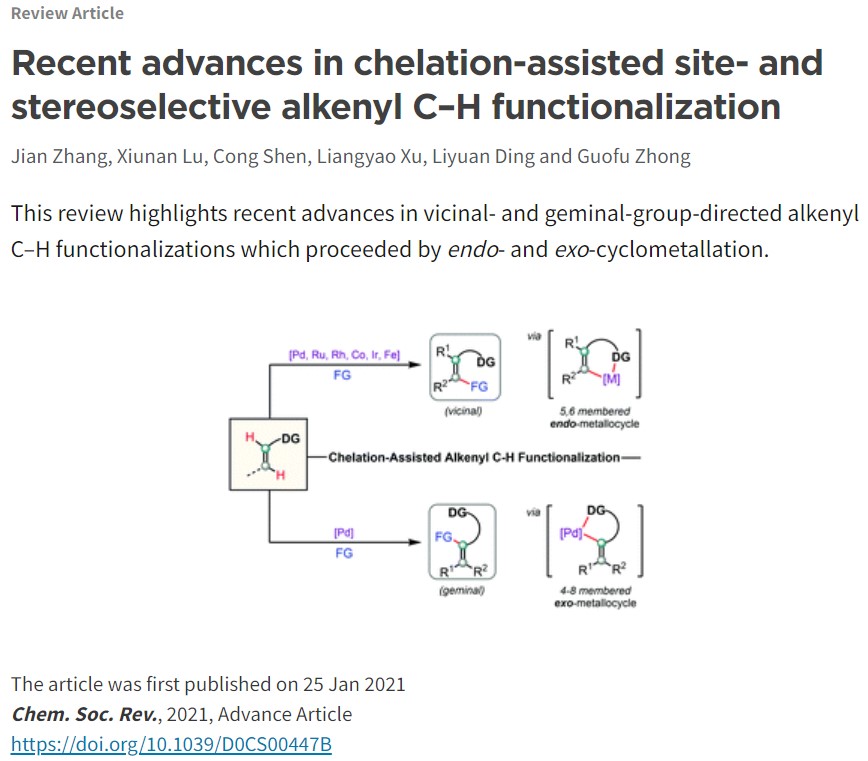 近日,大师兄影视 大师兄影视 的张坚教授与钟国富教授,凭借课题组近五年来在配位导向下烯烃惰性碳氢键的选择性活化/官能团化研究领域的出色工作,受邀总结了本课题组和国内外同行们在该领域中同碳位和邻碳位碳氢键官能团化反应,包括:烯基化、烯丙基化、烷基化、芳基化、卤化、以及多米诺环化等,并对各种方法的优缺点进行归纳和总结,最后对该领域的发展和应用进行展望。该成果近日以题为“Recent advances in chelation-assisted site- and stereoselective alkenyl C–H functionalization”,在英国皇家化学学会顶级综述期刊Chemical Society Reviews(IF: 42.846)上发表(Chem. Soc. Rev., 2021, DOI: org/10.1039/D0CS00447B, Advance Article)。张坚教授和钟国富教授为该文章的共同通讯作者。