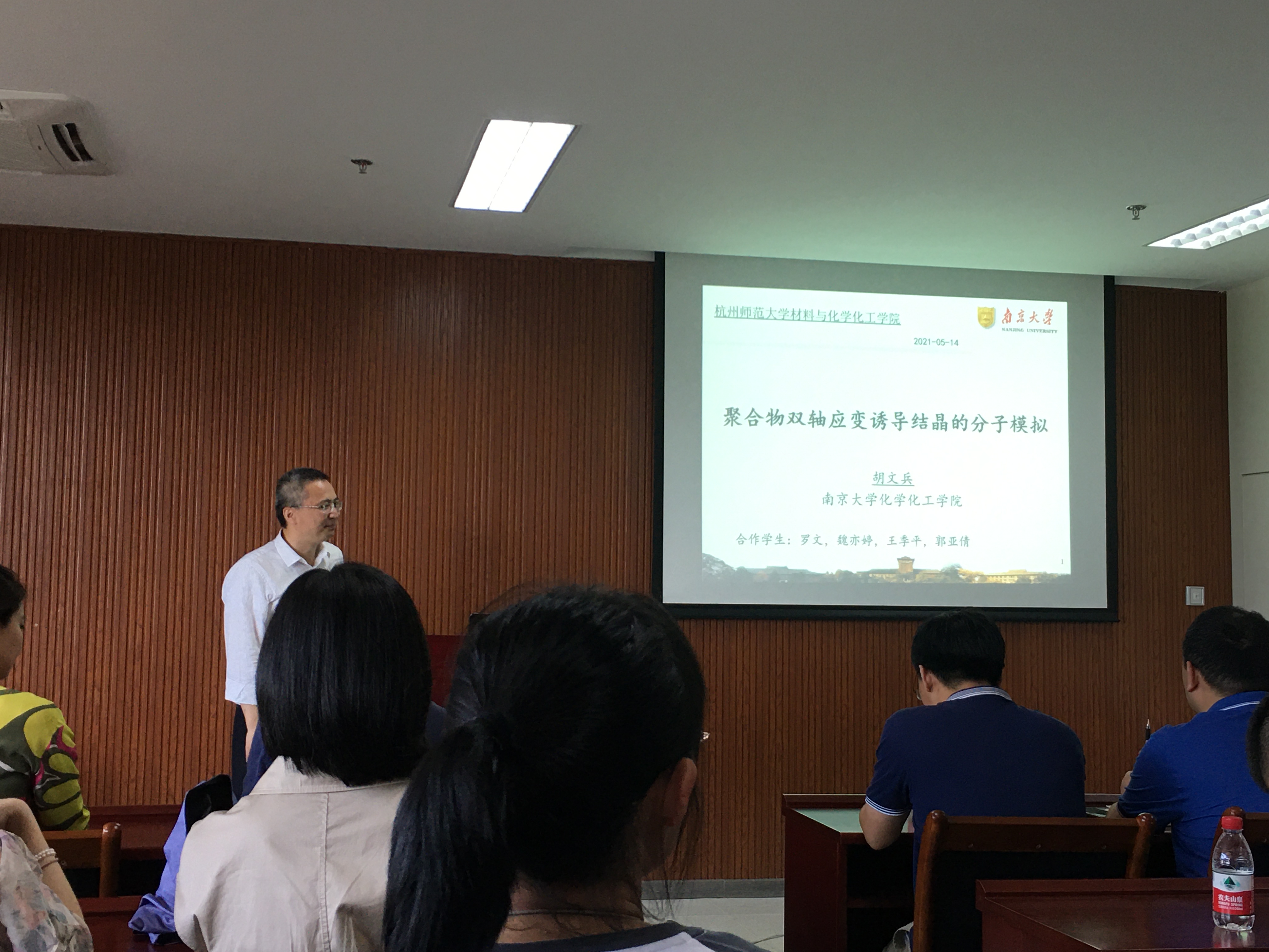2021年5月14日下午15:00,南京大学胡文兵教授应大师兄影视 李勇进教授的热情邀请,为材化师生做了题为“聚合物双轴应变诱导结晶的分子模型模拟研究”的学术报告。