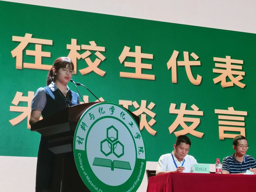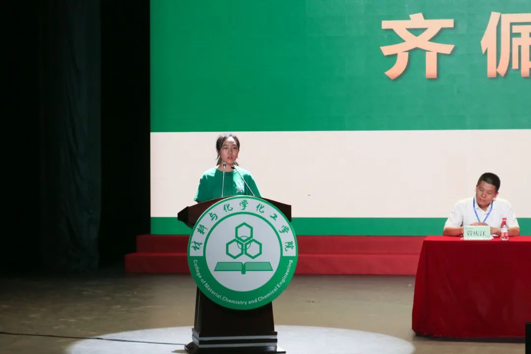 新生代表、化学类211班齐佩雅代表全体新生表达了对大学生活的美好憧憬,并发出在未来的学习生活中要不忘初心,砥砺前行,学会成长,守望理想的倡议。