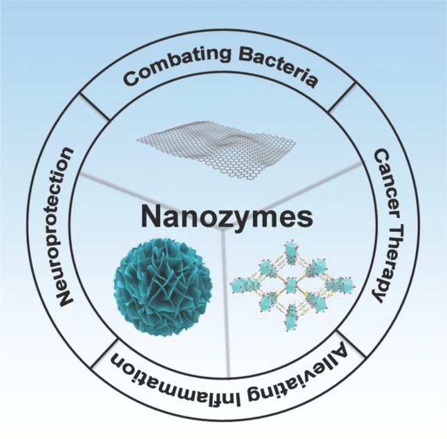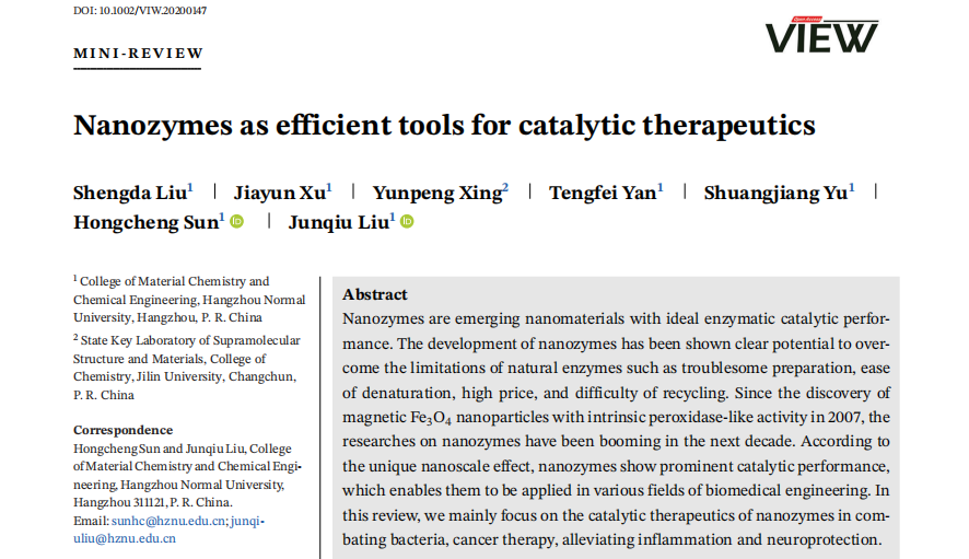 近日,我校大师兄影视 刘俊秋教授团队根据课题组及国内外同行在仿酶催化领域的出色工作,受邀总结了有关纳米酶在催化治疗方面的应用,包括:抗菌、癌症治疗、缓解炎症和神经保护等,最后对该领域的发展和应用进行展望。相关内容以“Nanozymes as efficient tools for catalytic therapeutics”为题发表在VIEW (2021, 20200147)。