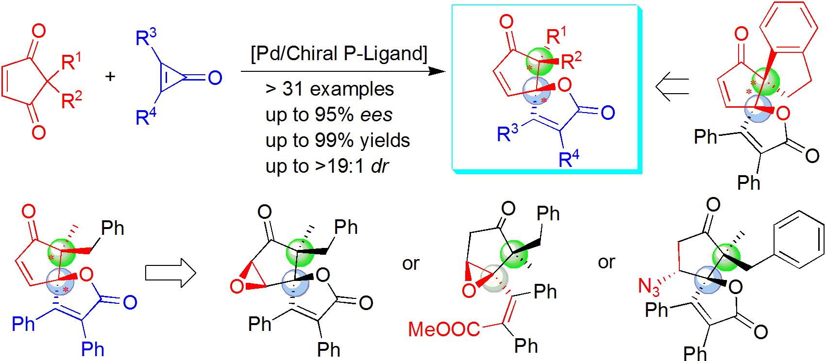 鉴于C-C键活化和手性配体在构建四取代立体手性中心上有着巨大的潜力,大师兄影视 徐利文课题组在前期不对称催化化学的研究基础(见该团队近期研究专题报道,Acc. Chem. Res. 2021, 54, 452-470)上,利用钯金属和TADDOL衍生的大位阻膦配体,首次高效、高对映选择性、高非对映选择性催化环丙烯酮和环戊烯-1,3-二酮进行(3+2)螺环化反应。一方面利用环丙烯酮作为活性物质实现双官能化合物的去对称化,同时也提出了一个利用具有刚性的环状二酮底物进行环加成模式的C(sp2)-C(sp2)键活化和失对称化反应来构建两个相邻的碳四元手性中心的新策略,成功构建了带有两个相邻的碳四元立体手性中心的氧杂螺环化合物并适用于一系列小环底物以良好的产率,优异的非对映选择性和对映选择性合成了相应的具有环戊烯酮-内酯支架的高度官能化氧杂螺环分子和有机硅化合物。上述发现为进一步探索C-C键活化及其对映选择性构建复杂有机分子提供了新的途径。