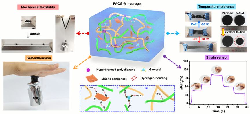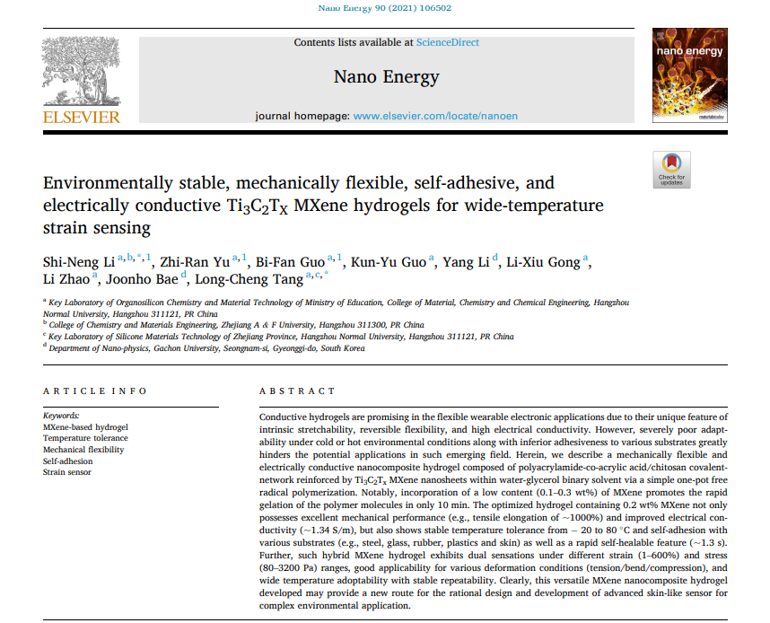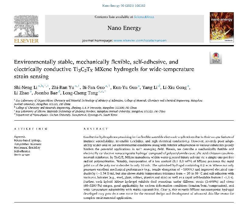 近日,大师兄影视 汤龙程研究员团队及其合作者浙江农林大学厉世能博士在国际知名期刊Nano Energy上发表题为“Environmentally stable, mechanically flexible, self-adhesive, and electrically conductive Ti3C2Tx MXene hydrogels for wide-temperature strain sensing”的文章(2021, 90, 106502;IF=17.881)。