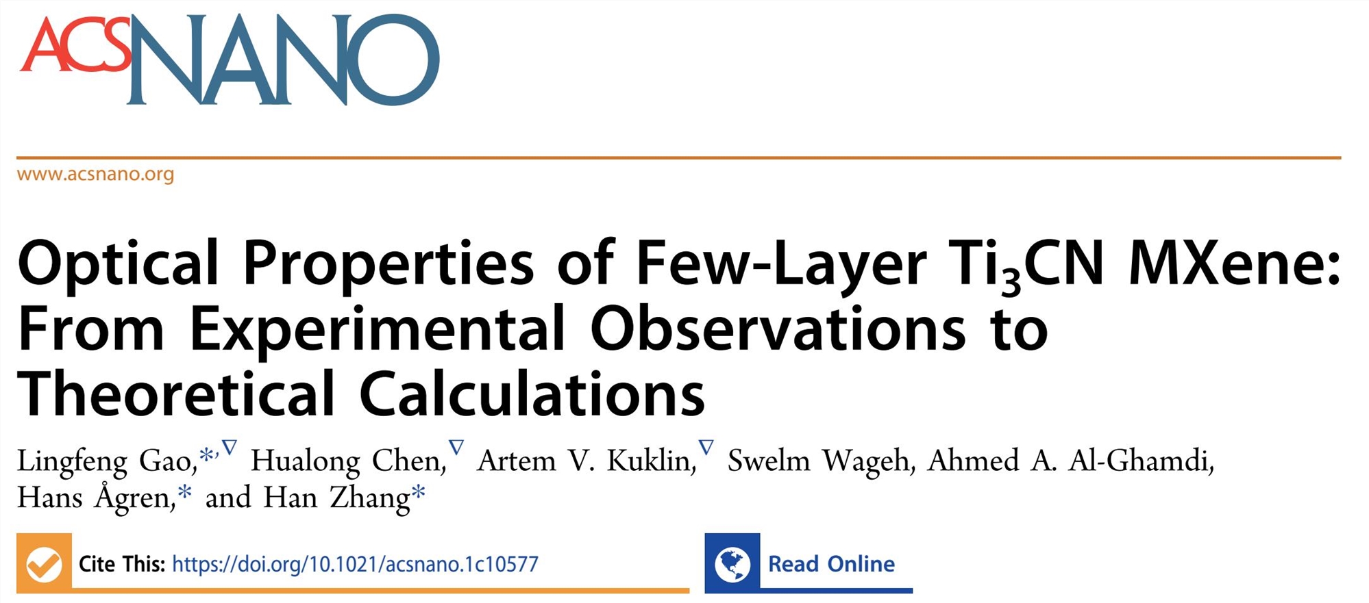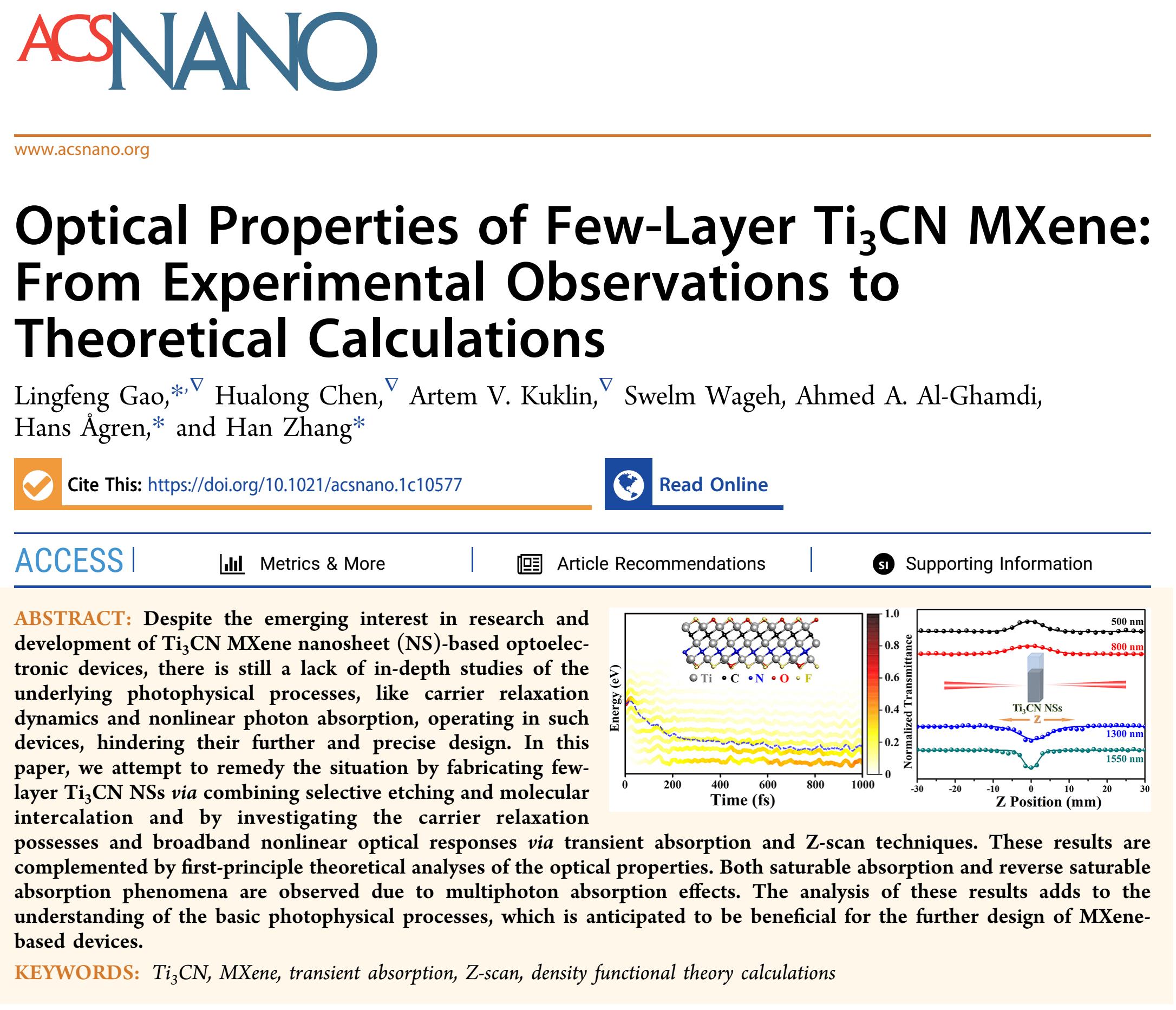 近日,大师兄影视 高凌锋副教授与深圳大学张晗教授以及乌普萨拉大学Hans Ågren教授合作系统研究了少层Ti3CN MXene的光学性质。团队近两年在少层MXene材料方面积累了丰富的经验,例如总结了MXene/聚合物复合薄膜(Chem. Mater., 2020, 32, 1703-1747,ESI高被引)和首次提出异质MXene的概念(Adv. Mater., 2021, 33, 2004129),系统对比了Ti3C2和Ti3CN的非线性光学行为(Nanoscale, 2021, 13, 15891-15898),研究了少层Nb2C MXene的非线性光学行为(Small Methods, 2020, 4, 2000250),并以此指导基于Nb2C的飞秒锁模光纤激光器和光电探测器的构建(ACS Nano, 2021, 15, 954-965,ESI高被引;Mater. Today Phys., 2021, 21, 100479)以及拓展少层Nb2C在全光调制(Nanophotonics, 2021, 10, 2617-2623)和可饱和吸收体(Opt. Laser Technol., 2021, 142, 107199)方面的应用等。在本项工作中,团队采用氢氟酸刻蚀和小分子插层的手段制备出具有高质量的少层Ti3CN MXene,随后通过瞬态吸收和Z-扫描技术对Ti3CN MXene的光学性质展开研究,结合第一性原理计算揭示了其载流子动力学和宽带非线性光学响应行为。结果显示,该少层Ti3CN MXene具有超快弛豫时间,其非线性光学行为可随波长的变化而调节,预期在光电器件领域将展现出巨大的应用前景。相关成果以 “Optical Properties of Few-Layer Ti3CN MXene: From Experimental Observations to Theoretical Calculations”为标题发表于国际纳米科技著名期刊《ACS Nano》上。