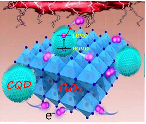 太阳每年向地球提供的能量达到了173000 TW,是全世界年能源消耗的9000倍,太阳能的高效利用是解决全球能源危机的终极方案。在太阳光中,红外光能量占比超过50%,然而由于红外光子的能量较弱,其利用是目前公认的世界级难题。针对上述挑战,高鹏教授、叶伟副教授、熊宇杰教授设计了一个具有强相互作用的二氧化钛/石墨烯量子点(GQD)复合体系。利用石墨烯量子点对红外光的上转换功能,实现材料在红外光下催化性能。研究结果表明,该类材料的太阳能到氢能的转化效率提升到0.80%。这项工作为设计高性能光催化剂提供了新的途径。