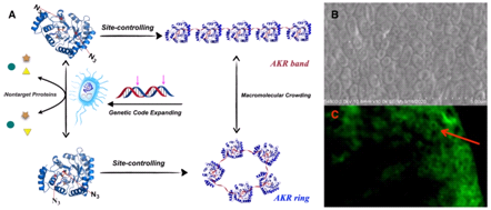 基于酶结构的分析合理地将不同数目非天然氨基酸插入序列中(图2),通过调整非天然氨基酸插入位置,还可精准地指导和控制目标酶共价组,在细胞破碎液中即能得到线性或环形酶组装体。该法主要依据“死码活用”原理并利用反应基团的生物正交性,克服了生物催化中传统共价组装时,化学反应的随机性和盲目性,及由此产生的酶活性中心破坏或掩埋问题,该法可进一步推广用于工业生物催化中其他酶种。