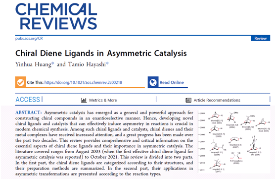近日,我校大师兄影视 邱化玉教授团队黄银华与Tamio Hayashi 教授合作,以大师兄影视 为第一单位在《Chemical Reviews》上发表题为“Chiral Diene Ligands in Asymmetric Catalysis”的综述文章 (//pubs.acs.org/doi/10.1021/acs.chemrev.2c00218)。《Chemical Reviews》(2022影响因子:72.087)是由美国化学会于1924年创刊并发行至今的国际化学领域内最具权威性的学术期刊之一,致力于发表最具影响力的综述文章,以综合性、权威性以及可读性强而著称。这是我校化学学科在该杂志发表的第一篇论文。