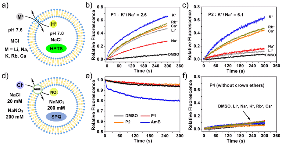 研究发现,在一定的单体比例条件下,柔性聚合物上的冠醚基团可以对钾离子进行选择性跨膜传输。由于胆固醇具有十分优异的嵌膜能力,因此,当在聚合物当中引入少量胆固醇作为“锚定”基团,可以使聚合物的嵌膜稳定性大大增加,并且通道的K+/Na+传输的选择性也得到了明显增强(图2)。平面脂双层单通道电流实验表明,不含胆固醇基团的聚合物P1在磷脂膜上并没有形成稳定孔道结构,而是以载体形式进行离子跨膜传递。而含有胆固醇作为“锚定”基团的聚合物P2在可以明显观测到平稳的方波型电流信号,因此可以判断苯并18-冠醚-6基团能够在P2上排列形成规则纳米孔并进行离子传输。