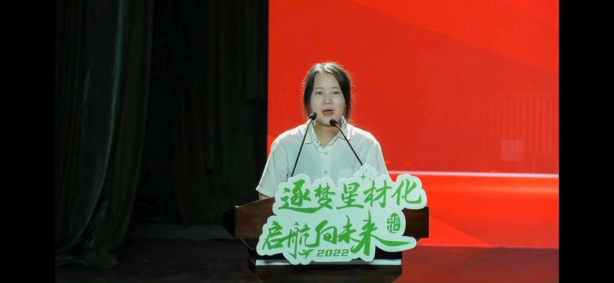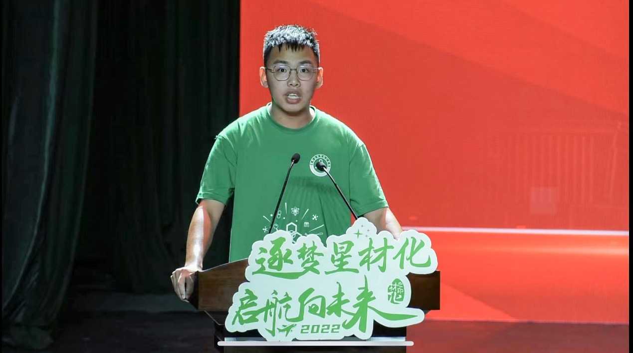 新生代表、化学师范221班俞晨阳同学诉说了他在初次踏入校园时的感想。他代表全体新生感谢师大严厉又慈祥的老师,并呼吁新生们挥洒青春,努力做到学业有成,梦想成真。