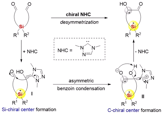 氮杂环卡宾催化剂(NHC)作为有机小分子催化领域的重要部分之一,以反应条件温和,产物对映选择性高等优点,常常被用于不对称催化合成。杨丽敏团队一直致力于发展新颖的NHC催化方法来制备具有潜在生物活性和应用前景的手性化合物。在前期工作基础上,作者设想:在前手性硅烷中引入两个相同的醛基,然后利用手性氮杂环卡宾所处特殊的手性环境使其与其中的一个醛基结合生成Breslow中间体I(硅立体中心的构建),中间体I接下来与另一个醛基发生安息香缩合反应得到中间体II(碳立体中心的构建),最后中间体II通过分子内质子转移得到同时含有硅和碳立体中心的手性硅环类化合物,同时再生卡宾催化剂用于接下来的催化循环。(图1)