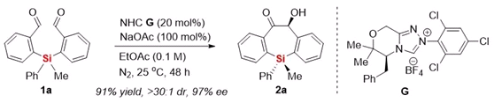 鉴于此,作者通过对手性NHC催化剂,碱和溶剂的一系列筛选,最终确定了苯基甲基取代的含硅二醛1a在20 mol%氮杂环卡宾G的催化下,以醋酸钠(NaOAc)作为碱,在乙酸乙酯(EtOAc)中,25 ℃下反应48小时,可以以91%的收率,>30:1的dr值和97%的ee值获得目标产物2a(图2)。