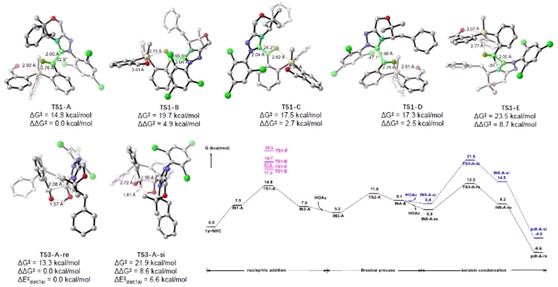 最后,作者通过密度泛函理论(DFT)计算的方法对反应的机理和反应过程中硅手性和碳手性的来源进行了阐述。当氮杂环卡宾催化剂G对苯基甲基取代的含硅二醛1a进行加成时,通过过渡态TS1-A所需的能量最低(14.8 kcal/mol),生成的是(S)构型的硅立体中心。而在进行安息香缩合反应时,中间体从re面经过过渡态TS3-A-re进攻比从si面经过渡态TS3-A-si进攻所需的能量低8.6 kcal/mol,得到的是(S)构型的碳立体中心(图3)。本计算所得结果与实验所得结果相一致。
