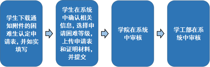 本科生困难生认定工作在“学生工作管理服务平台”(以下简称“学工平台”)(//xgxt.dsxfilms.com/)中进行。具体流程如下: