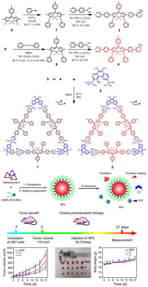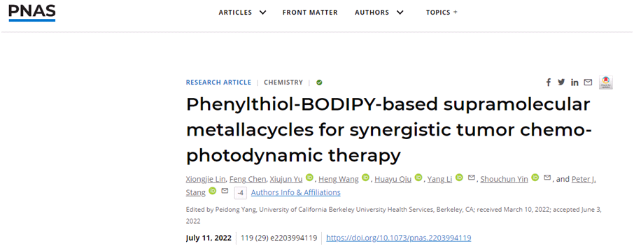 近日,我校邱化玉团队和美国犹他大学Peter J. Stang教授课题组在功能性超分子金属环协同应用于肿瘤化疗和光动力治疗方面取得最新进展,相关研究发表于著名国际期刊PROCEEDINGS OF THE NATIONAL ACADEMY OF SCIENCES OF THE UNITED STATES OF AMERICA(IF = 12.779),论文题目为“Phenylthiol-BODIPY-based supramolecular metallacycles for synergistic tumor chemo-photodynamic therapy”。