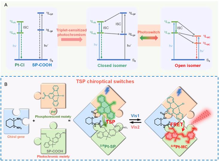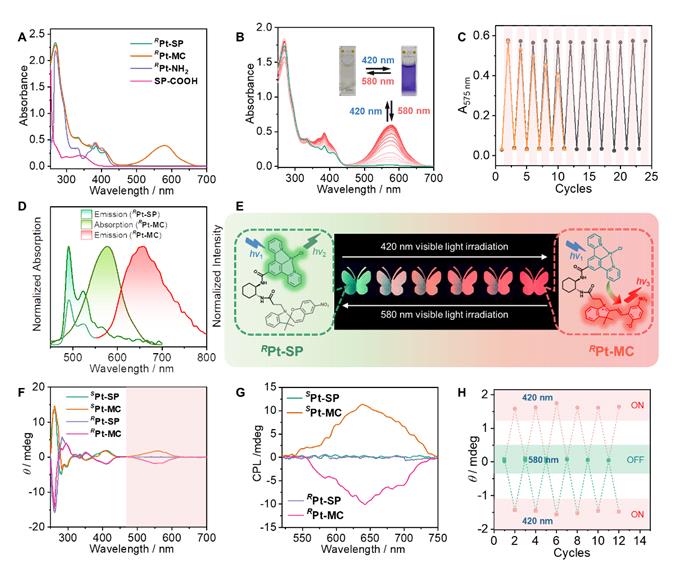 基于环金属铂(II)配合物的组装调控以及丰富的光物理性质研究基础,利用金属中心的三重态敏化效应,可以实现可见光光开关,降低辐照能量的同时,有效提升了开光分子的光稳定性以及抗疲劳性。另外,基于发绿光的环金属Pt(II)配合物部分与开环的MC异构体之间存在有效的共振能量转移(FRET)效应,不仅可以提升材料的发光性能,而且可以用于发光行为的动态调控,丰富发光开关的性质。由于四方平面铂(II)配合物的刚性特点以及分子开关结构的不对称性,同时实现手性放大以及金属Pt(II)中心到开环部花青部分的手性传递,最终得到激发态CPL信号(图2)。