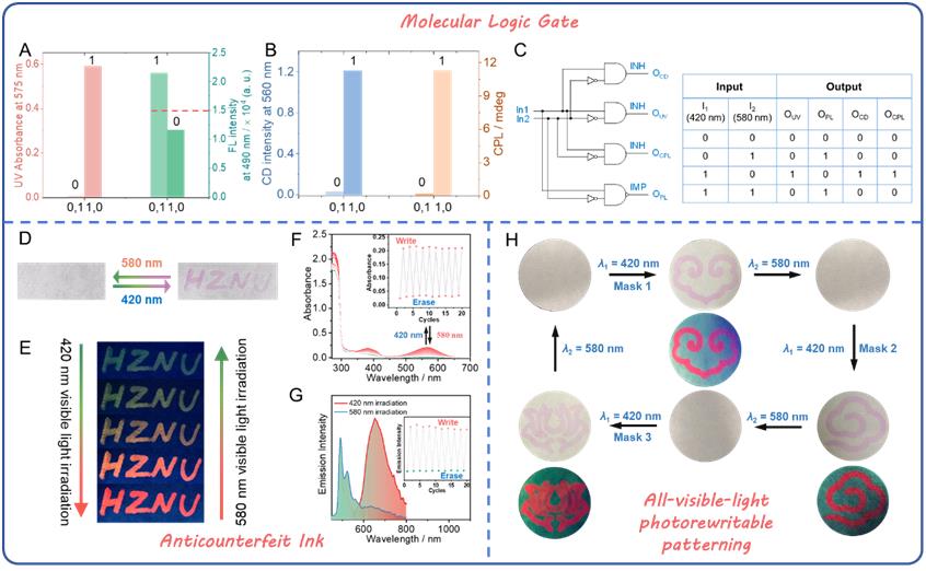 图3.分子逻辑门、防伪墨水和全可见光光可重写图案应用