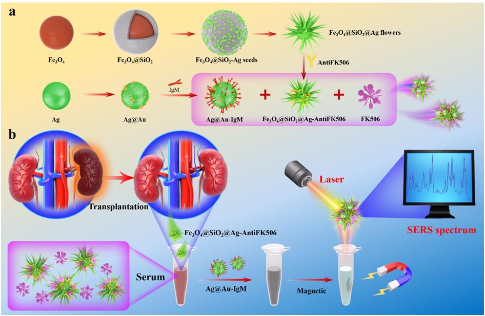图1 (a-b)基于双等离子体超结构的三明治SERS传感器检测患者血液样本中FK506的示意图。