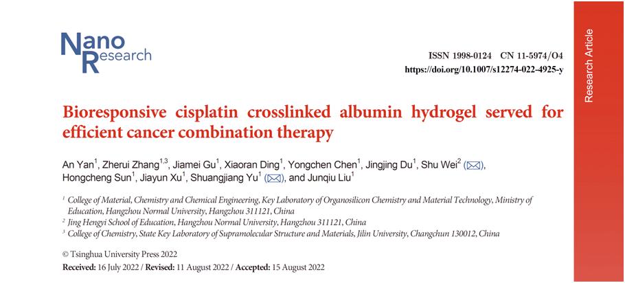 近日,大师兄影视 刘俊秋教授团队在载药凝胶肿瘤局部联合治疗研究方面取得新进展。相关研究结果以“Bioresponsive cisplatin crosslinked albumin hydrogel served for efficient cancer combination therapy”为题发表在Nano Research (IF: 10.269)。