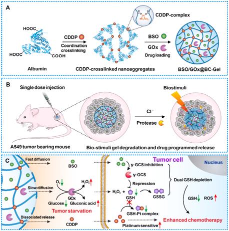 图1.基于时序药物释放和双重谷胱甘肽消耗策略的生物刺激响应白蛋白水凝胶支架(BC-Gel)示意图。(A)载药水凝胶(BSO/GOx@BC-Gel)的制备;(B) BSO/GOx@BC-Gel单次局部给药和药物的瘤内程序化释放;(C)双重谷胱甘肽耗竭与癌症联合治疗的机制。